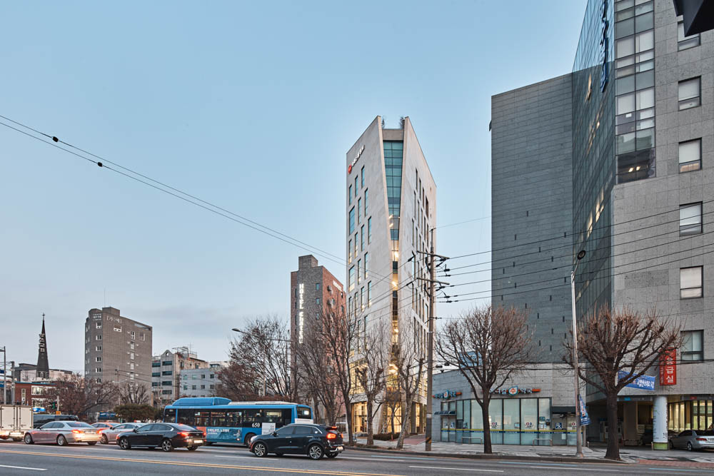 Located at Yangnam intersection, the 300m² site had a severely irregular shape as it had a strong corner of about 45 degrees to the roadside and five vertices. The physical scale within the legally permitted limits was reviewed, but it had a smaller height limit compared to the surrounding buildings.