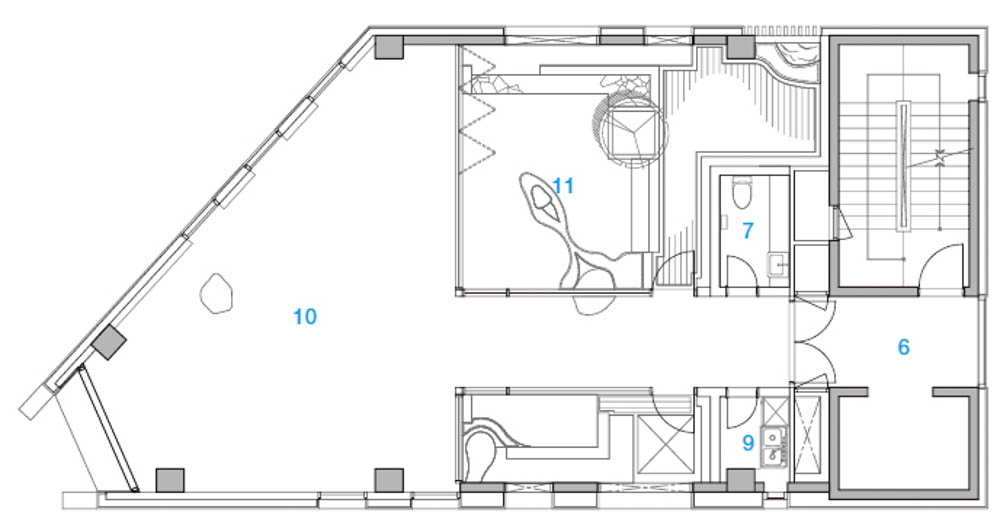 45도 모서리는 평면적인 사용성의 결함과 외부에서 보이는 시각적인 포인트의 가능성을 함께 갖고 있었다. 솔리드한 벽체는 서로 만나지만 열린 형태가 되게 했고 수직의 선형도 변화를 주어 모서리의 형태가 완화되도록 했다. 두 입면의 열린 공간 사이에 있는 화려한 서어나무는 대지와 건물이 갖는 모서리의 방향성을 주변으로 확산시키고 소실되도록 하여 디자인 의도를 보다 강하게 드러내도록 했다.