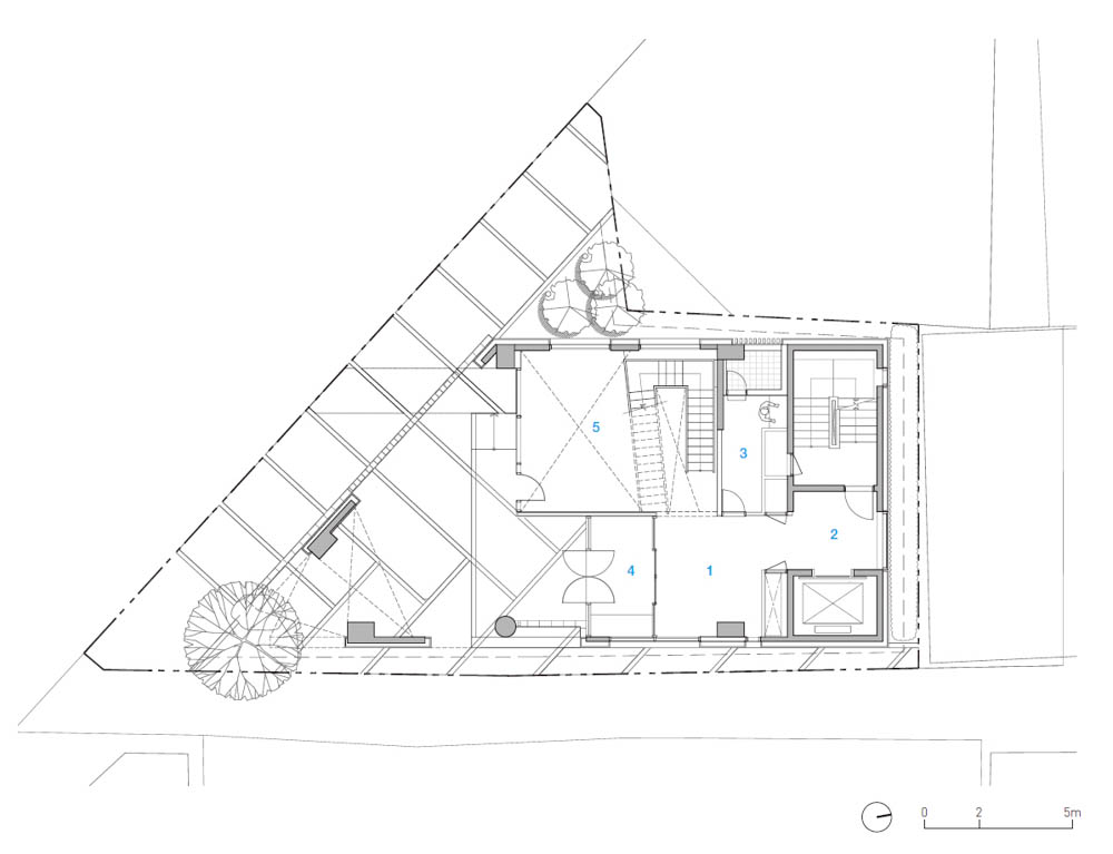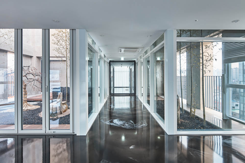 45도 모서리는 평면적인 사용성의 결함과 외부에서 보이는 시각적인 포인트의 가능성을 함께 갖고 있었다. 솔리드한 벽체는 서로 만나지만 열린 형태가 되게 했고 수직의 선형도 변화를 주어 모서리의 형태가 완화되도록 했다. 두 입면의 열린 공간 사이에 있는 화려한 서어나무는 대지와 건물이 갖는 모서리의 방향성을 주변으로 확산시키고 소실되도록 하여 디자인 의도를 보다 강하게 드러내도록 했다.