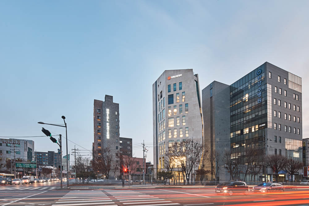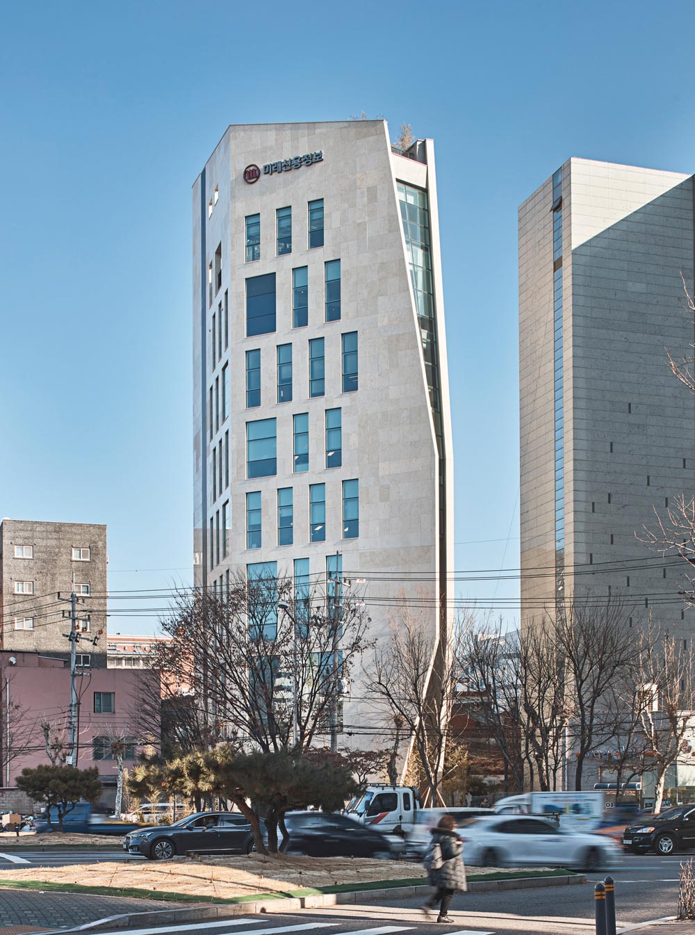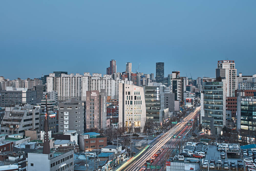 Located at Yangnam intersection, the 300m² site had a severely irregular shape as it had a strong corner of about 45 degrees to the roadside and five vertices. The physical scale within the legally permitted limits was reviewed, but it had a smaller height limit compared to the surrounding buildings.