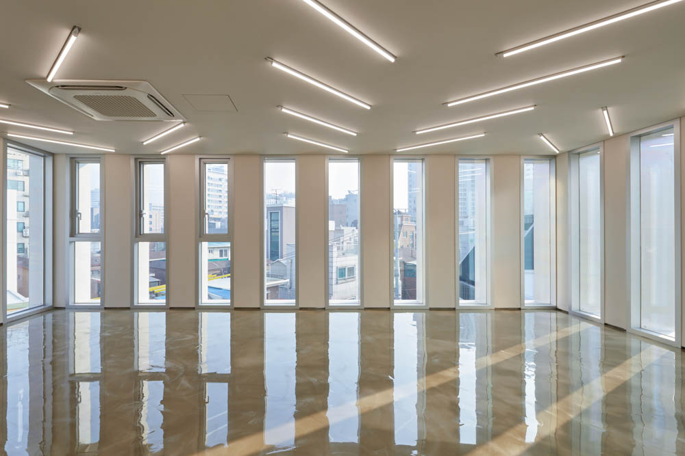 The material was a tool to make it stand out even more. Harmony with the street was given to the lower floor and the role of revealing the architecture to the upper mass. The concrete-based tile on the lower floor is a material selected mainly by reflecting the context of the surrounding buildings, which gives a sense of weight and lumps. On the other hand, the transparent glass windows through which the mass is pierced and the balcony opening on the second-floor contrast with the heavy material and become a show window facing the commercial street. The upper part was finished with specially painted thin ceramic tiles. The paint finish that feels like a seashell changes color depending on the intensity and direction of sunlight. In the upper part of the office use, vertically long windows are repeatedly arranged to increase the sense of openness from the inside while blocking the gaze from the outside.