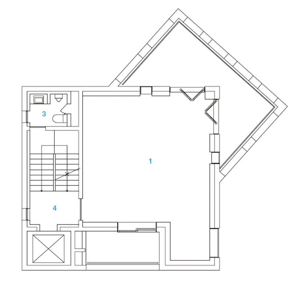 각 층이 물러나고 쌓이면서 만들어지는 공간들은 자연스럽게 층마다 외부 발코니를 만들어냈다. 뿐만 아니라 법규에 따라 생긴 층별 외부공간은 임대공간의 환경개선 및 임대료 증가에 기여하는데, 이는 마포구 내규의 ‘건축물의 발코니 개수 제한(마포구에서는 불법건축물 예방 차원에서 계단식 건물의 형태를 제한하고 있다)’에 해당된다. 하층부 매스는 주변의 상업적 컨텍스트에 대응하며 주 도로를 마주하고, 상층부는 근접한 컨텍스트 대신 멀리 홍대지역 일대를 바라보는 방향으로 틀어져 있다.