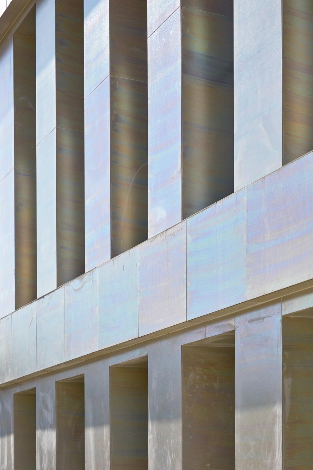 어반 스페이스에서 재료는 건축물을 돋보이게 만드는 도구다. 하층부에는 거리와의 조화를, 상층부 매스에는 건축물을 드러낸다. 하층부의 콘크리트 계열 타일은 무게감 있는 덩어리 느낌으로 주변 건물 속에서도 묵직한 존재감을 드러낸다. 반면, 매스를 뚫어낸 투명유리 창들과 2층의 발코니 개구부는 무거운 느낌의 재료와 대비를 이루며 상업거리에 면하고, 상층부는 특수도장한 박판 세라믹 타일이 세련된 느낌을 준다. 조개껍질 같은 도장마감은 햇빛의 강도와 방향에 따라 색을 바꿔간다. 사무소 용도의 상층부에는 외부로부터의 시선을 막아주면서 내부에서의 개방감은 높일 수 있는 수직으로 긴 창을 반복적으로 배치되어 있다.
