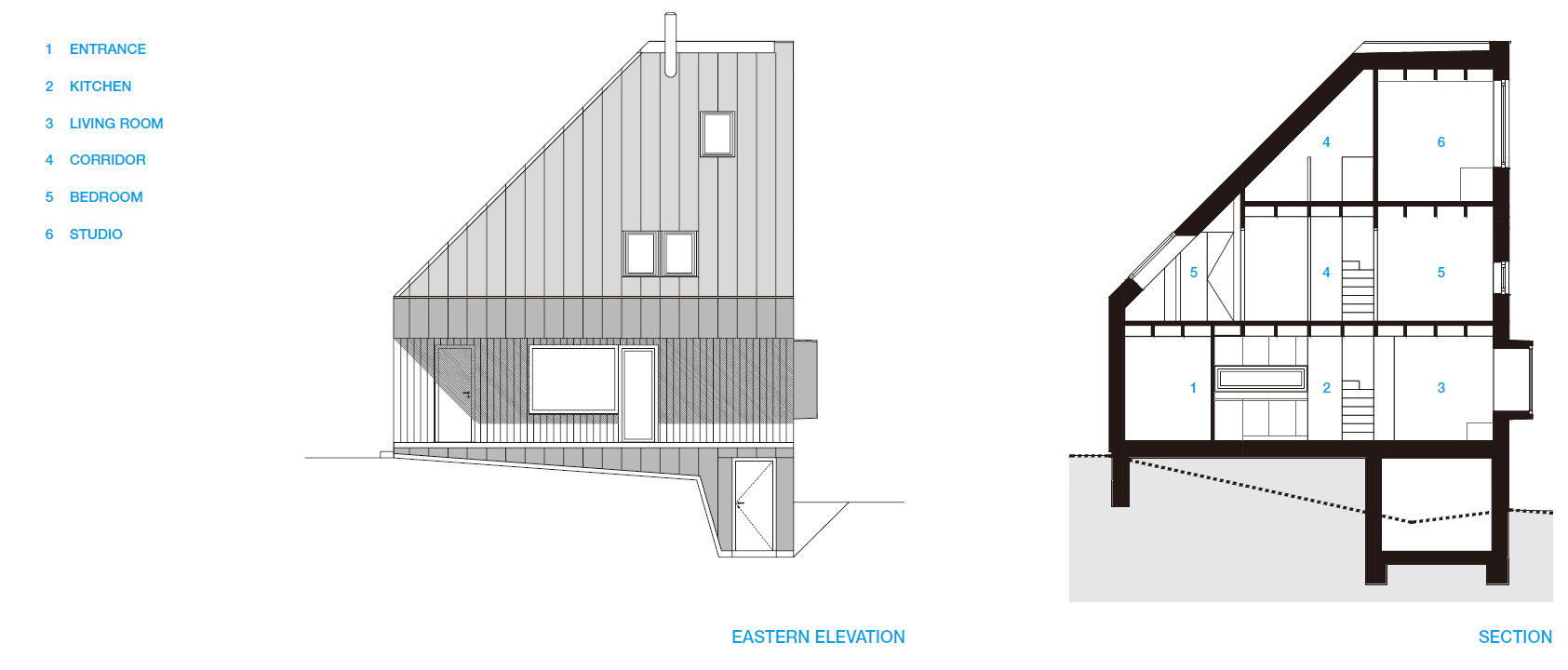 일반적인 2층이 아닌 3층의 형태로 만들어 각각의 고유한 특징을 지니도록 했다. 이 집의 가장 높은 층은 스튜디오, 도서관 그리고 쉴 수 있는 공간이 된다. 2.5m 길이의 정사각형 창을 통해 나무 꼭대기와 하늘을 비롯한 풍경을 볼 수 있다. 한 층 아래에는 욕실과 개방된 갤러리 공간과 쉴 수 있는 공간도 있다.