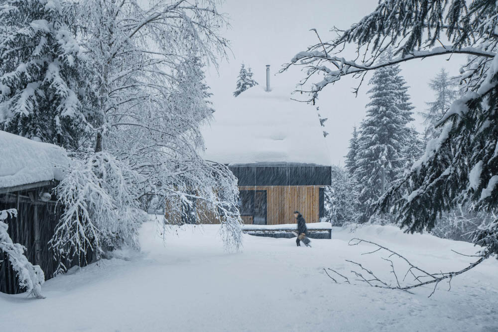 The new building is represented by an aerodynamic but angular figure, where classic elements, such as the roof and the wall, give way to a clear shape and merge with each other. The appearance was created through many precisely set spatial scenes of the interior and on the basis of seasonally changing local climatic conditions, as the snow load in winter requires the choice of a steep roof angle. The idea of a “lookout tower” also determines the height of the house from the inside. It should resemble a tower rather than a house and should also serve as a hideaway.