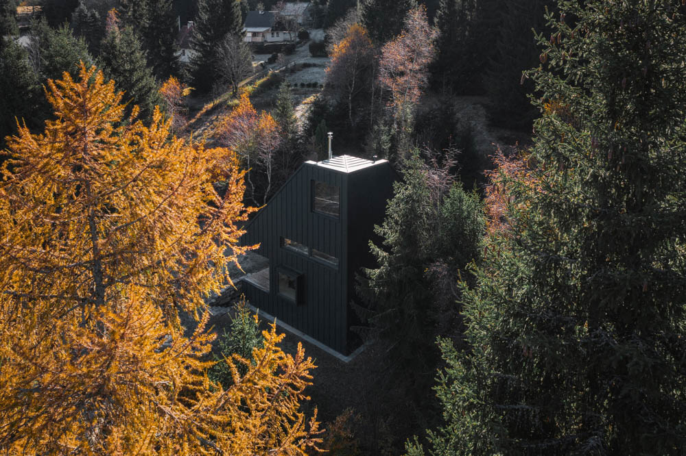 이 집은 숲에서 불과 몇 미터 떨어지지 않은 가까운 곳에 자리하고 있다. 옆에 있는 회반죽으로 마감된 집에 비해 나무들 사이에 숨겨져 있어, 마치 숲이 삼킨 것처럼 보인다. 디자인은 지역의 특성과 색상을 기반으로 하고 있고 회색의 음영이 나타난다. 처음부터 휴가용 주택의 외관과 지붕은 비슷한 색의 어두운 알루미늄으로 계획했다. 파사드 구조는 기름칠 된 검은 목재와 천천히 자라는 가문비 나무 줄기와 비슷한 강하고 거친 표면이 만들어지도록 사용됐다.