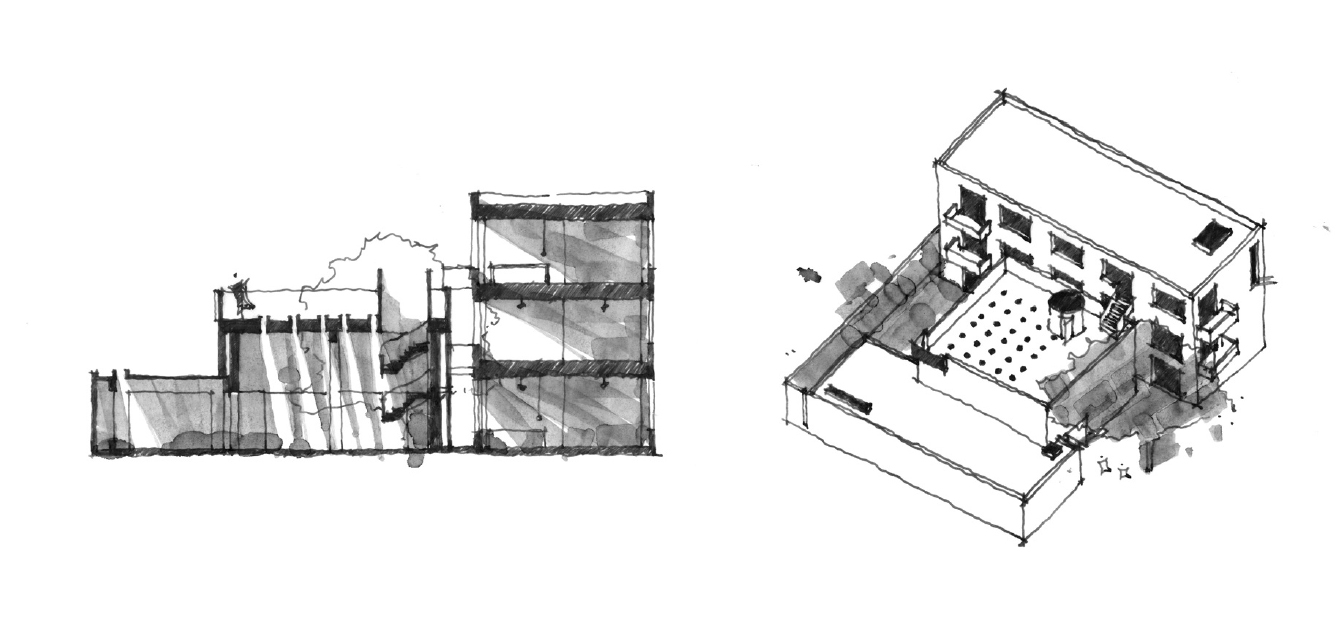 처음으로 건물1과 2의 파사드에 있는 창문을 막고 건물1의 내부 벽을 제거함으로써 통합된 “암실”을 만들어 내향적이고 밀폐된 분위기를 강조했다. 그 후 건물 외관을 재정비하고 단순화하여 건물의 기존 형태를 약화시켰다. 건물의 외부는 내부와 동일한 샌달우드 노란빛의 색으로 칠했다. 이로써 3개의 건물이 두드러질 만큼의 무결성과 인식을 되찾았다.