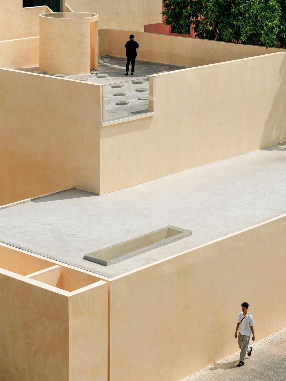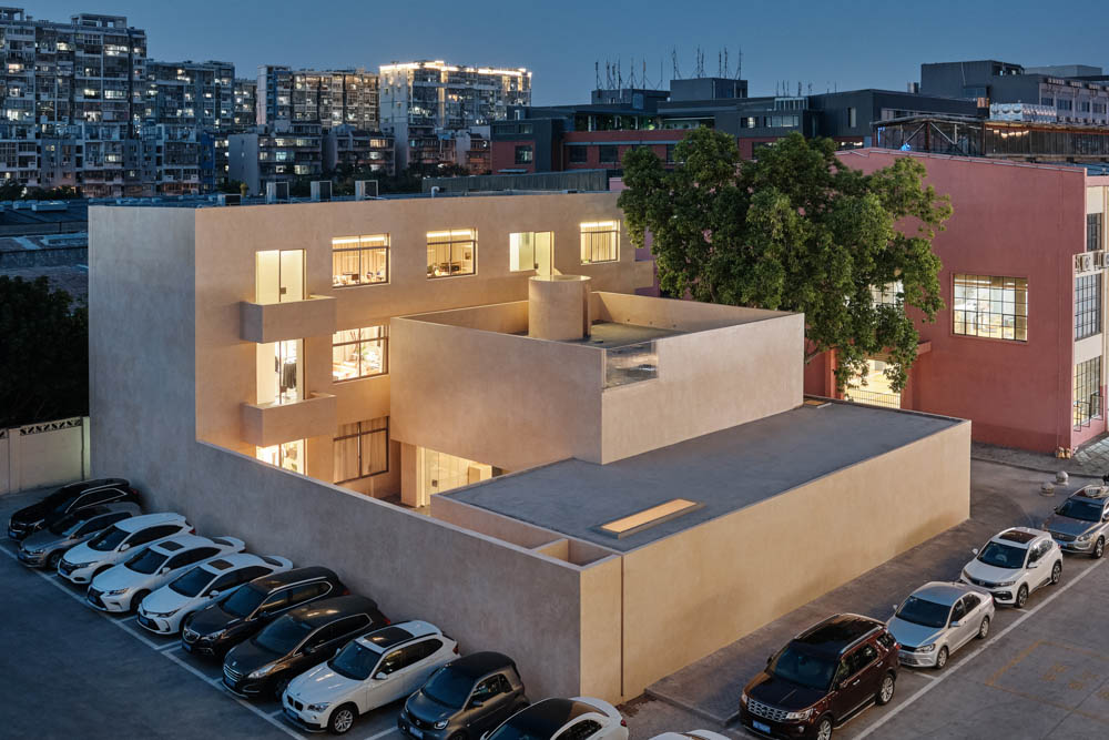First, we blocked up the windows on the façade of Building 1 and 2, and remove the internal walls of Building 1, thus creating a relatively integrated “darkroom”, emphasizing an introvert, enclosed atmosphere. Afterwards, we rearrange and simplified the exterior of the building, weakening the building’s original form. The exterior of the building is painted with the same sandalwood yellow color as the interior, thus making the three buildings regain the remarkable integrity and recognition.