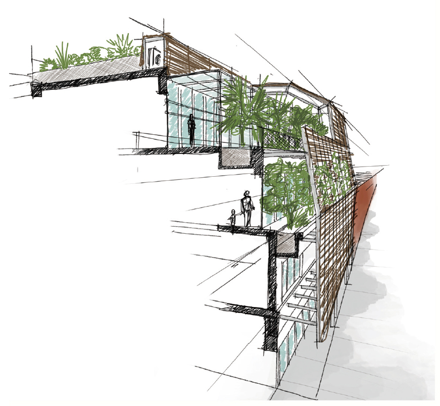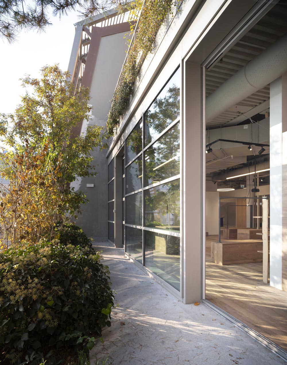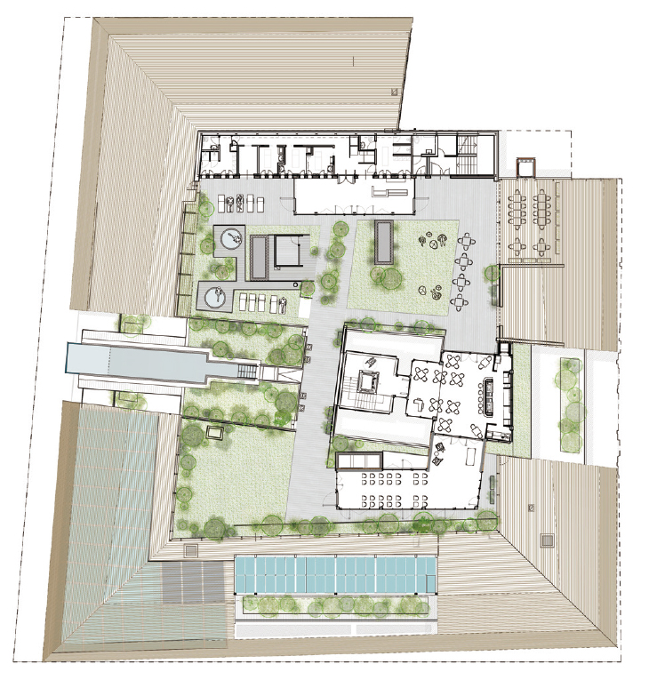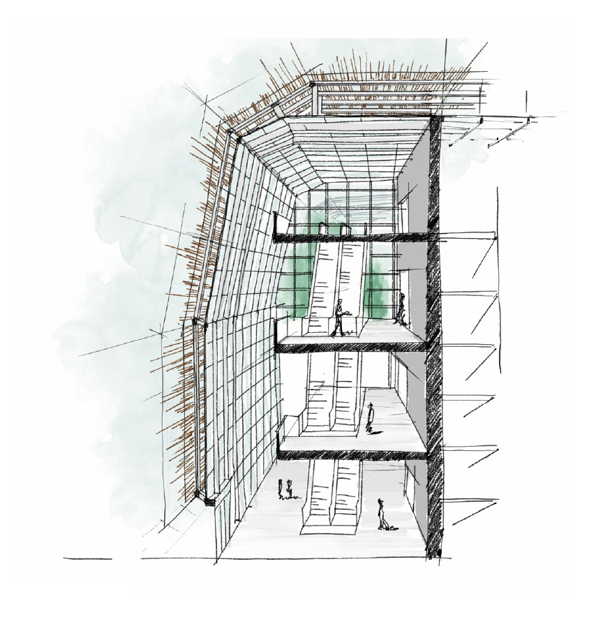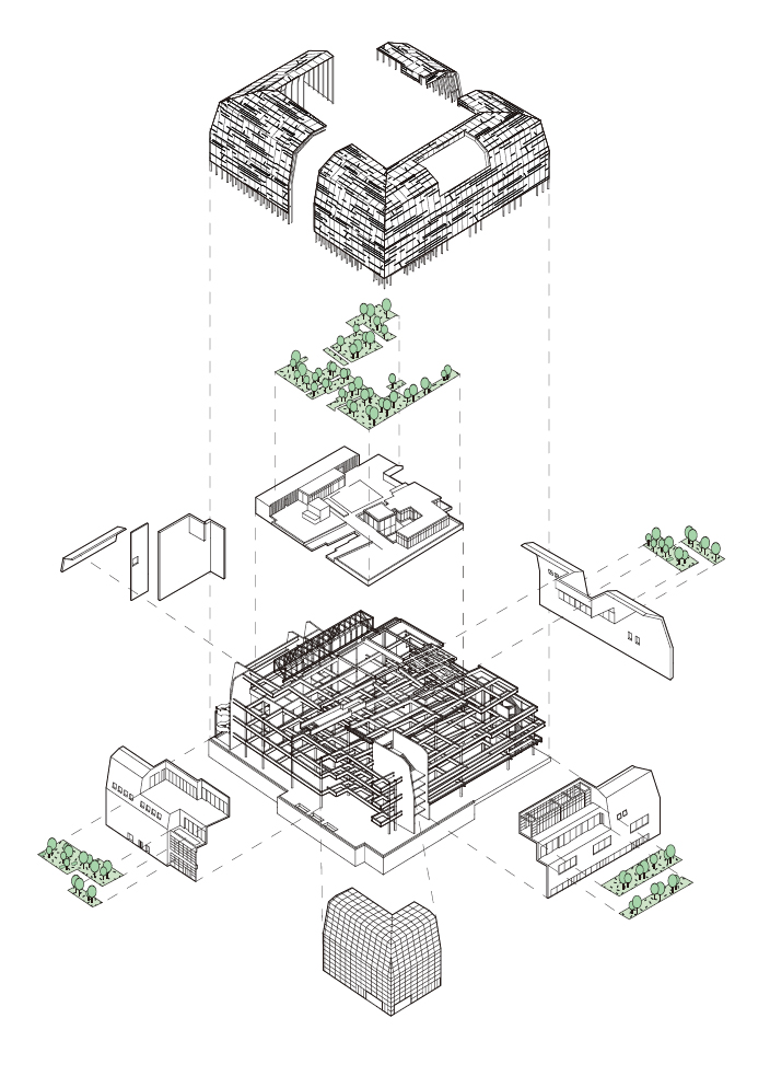 남북 방향의 볼륨은 나무가 식재된 테라스에 의해 형태가 깎이고 비워내며 녹지 공간을 남긴다. 생태 기후를 고려한 온실 지붕은 건물의 다섯 번째 정면이 되는 커다란 매달려 있는 정원이다.