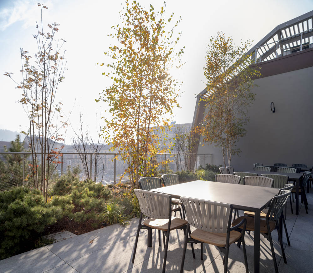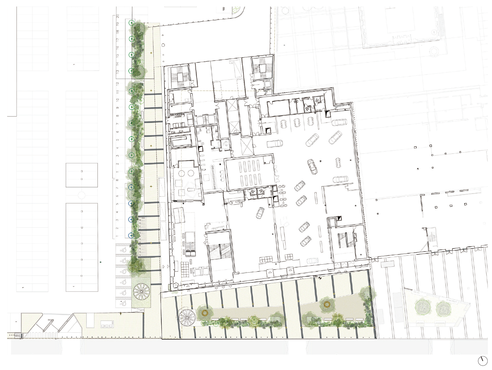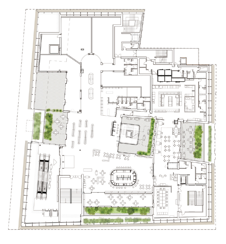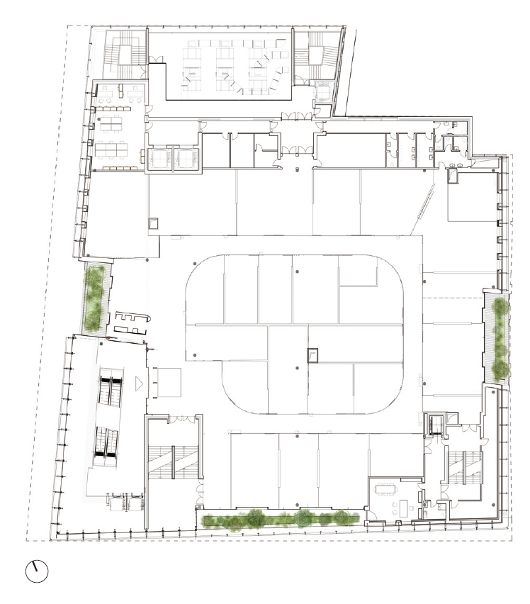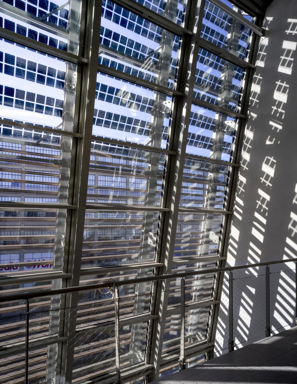 남북 방향의 볼륨은 나무가 식재된 테라스에 의해 형태가 깎이고 비워내며 녹지 공간을 남긴다. 생태 기후를 고려한 온실 지붕은 건물의 다섯 번째 정면이 되는 커다란 매달려 있는 정원이다.