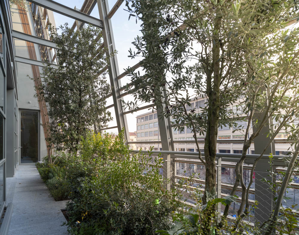 Green Pea’s sustainability criteria are also the basis of the landscape project. Greenery follows the spatial complexity of the building, inserts itself through the organic texture of the facades and becomes a real building part to dampen urban densification. Greenery, inserted in different combinations (basins, hanging gardens, green in the ground and draining pavements), develops vertically from the ground floor to the roof. The arboreal specimens, even large ones, proceed from one floor to the other and their bearing evokes the shapes of plants in their natural environment. In the interior, tall trees and shrubs are instead perceived through large windows and terraces and select the external views. By filtering the sunlight they also create a vibrant effect. The roof garden, in addition to mitigating the surface temperature and contributing to thermal insulation, is an extraordinary aesthetic experience amplified by the surprising views of the city.