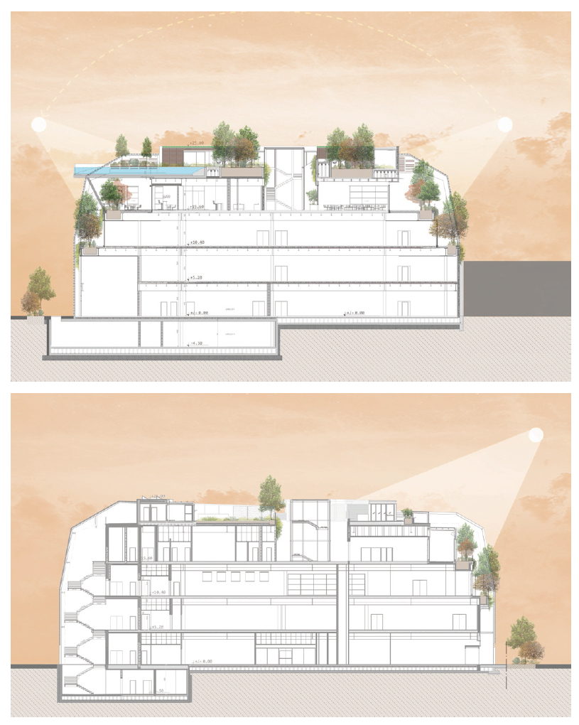 The volume, north-south oriented, is carved out by planted terraces and lightened by a central cut that leaves room for greenery. The bioclimatic greenhouse roof is a large hanging garden that becomes the fifth facade of the building.