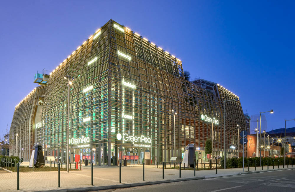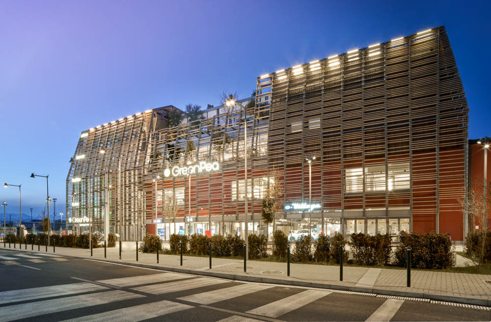 그린피 쇼핑센터(Green Pea)는 피아트 링고토(Fiat Lingotto) 인근 도시인 투린(Turin) 지역의 상업 시설이다. 이 건물의 재건은 렌조 피아노(Renzo Piano)가 1990년대에 계획한 다기능 센터로 전환한 후, 2007년 이전 카르파노(Carpano) 지역의 첫 번째 이탈리(Eataly)의 본사가 그린피(Green Pea)와 동일한 건축가에 의해 설계되면서 시작됐다. 20세기의 산업 발전에서 3차 산업혁명과 마주한 이 도시는 현재 지속가능성에 대한 건축적 모색을 드러내고 있다. 그린피는 지속가능성을 가지고 있는 건축물이면서, 방문자들의 쇼핑과 휴식을 위한 공간이다. 공간의 대부분은 환경과 자연에 대한 존중을 기반으로 신기술, 천연 자재로 건립됐다는 것이 큰 특징이다. 빛과 녹지가 스며든 유기적인 형태로 설계된 이 건물은 2018년 폭풍에 의해 일부 파괴된 숲에서 가져온 가문비나무로 된 루버 파사드를 가지고 있다.