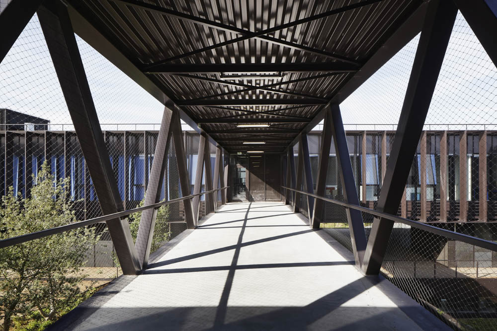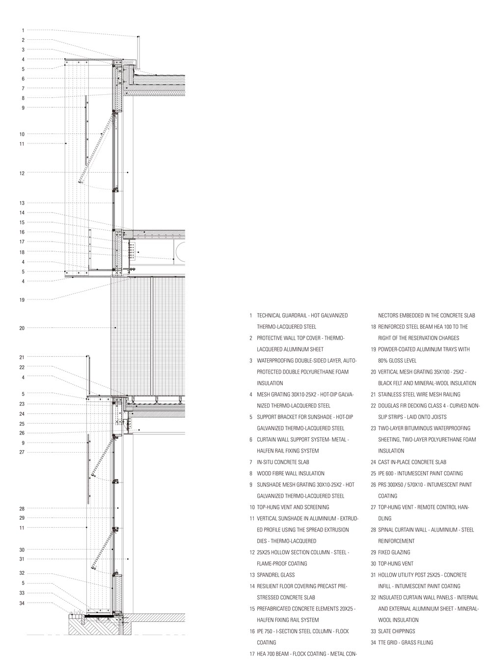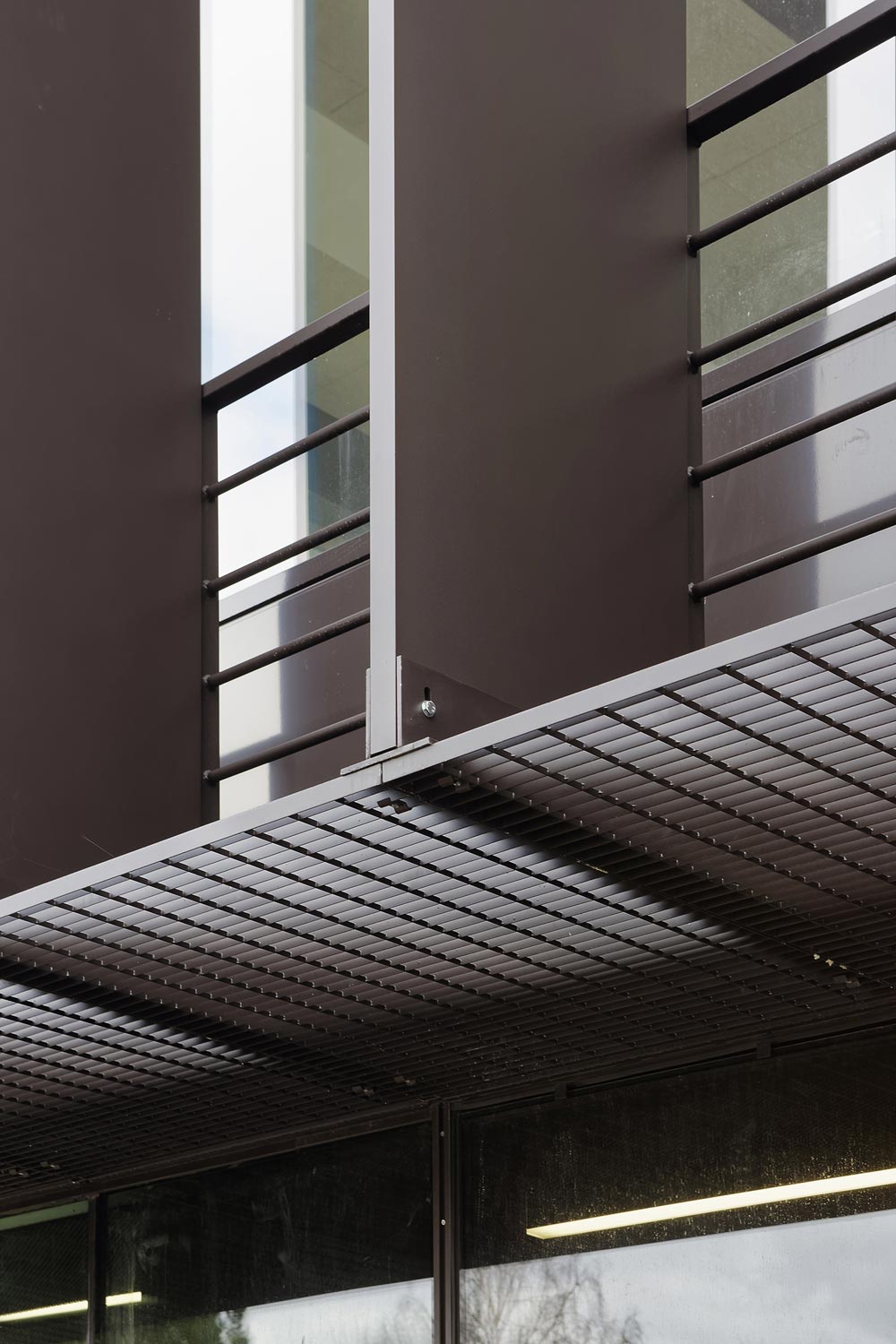 1.2m 단위로 나누어진 3.6m 길이의 하중 지지 골격이 건물을 구성한다. 가구와 정면 클래딩, 조명, 라디에이터 및 전기 단자는 동일한 규칙적인 패턴을 유지한다. 유틸리티 네트워크의 균일한 분포, 개구부의 반복적인 설계 및 내부 구조벽의 부재는 진정한 모듈식 유연성을 만든다. 태양광 스크린은 시야를 열어 두도록 고정되어 있다. 이들은 각 파사드의 방향에 맞게 조정되며 1 층의 높은 유리 벽에 강성을 제공하고 2층의 서비스 통로를 지원하여 구조적 역할을 한다. 경제적인 재료 사용과 심플한 구조의 건설과정을 통해 구조는 하중을 지지하기 위한 것만이 아니라는 것을 보여주는 프로젝트다.