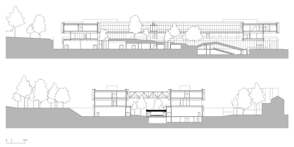 The new building is distributed on three levels. On the ground floor are areas for technical instruction with workshops, cloakrooms and stores, forming a U around the courtyard and opening onto the forecourt. Movement is distributed via two interior streets which, as well as providing natural light, facilitate orientation within the complex. The ground floor is built into the slope, so that the first floor, where the college’s student and administrative life takes place, is on the same level as the park that will eventually run through the building. These functions are connected by large covered patios, creating a selective dialogue between themselves and the world outside. On the second floor, classrooms provide exclusive views over the park and the central garden.
