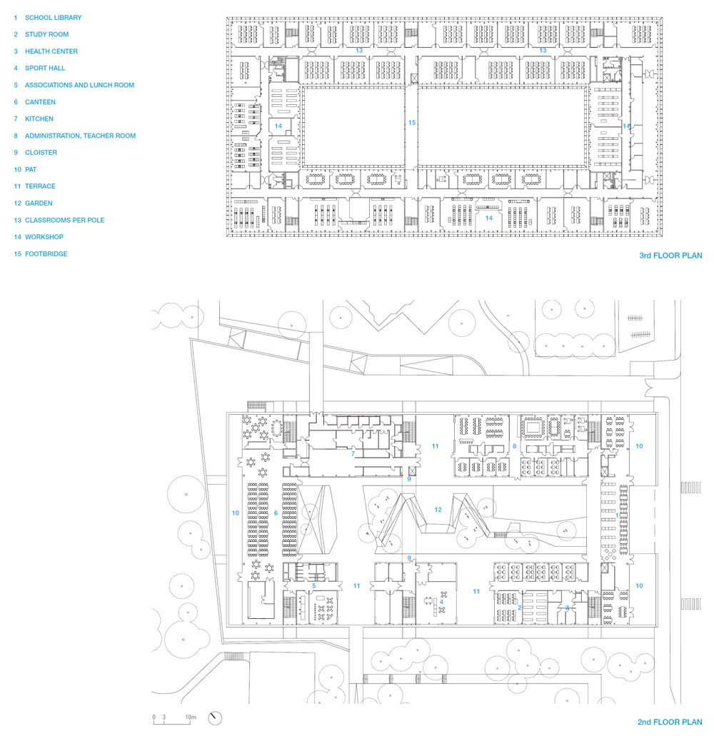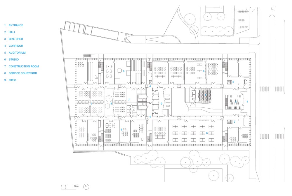 새 건물은 세 층으로 나눠져 있다. 1층에는 작업장, 휴대품 보관소 및 상점과 기술 교육 공간이 있으며, 중정 둘레로 ㄷ자 형태의 공간을 형성하고 이곳은 앞마당으로 연결된다. 두 갈래의 내부 동선은 자연 채광을 제공할 뿐만 아니라 단지 안으로 향하는 것을 용이하게 한다. 대학의 학생과 행정 생활이 이루어지는 1층은 결국 건물을 통과하게 될 공원과 같은 층에 있다. 이러한 기능은 지붕이 있는 넓은 파티오로 연결되어 외부와 선택적인 대화를 만들어낸다. 2층의 강의실은 공원과 중정의 독점적인 전망을 제공한다.