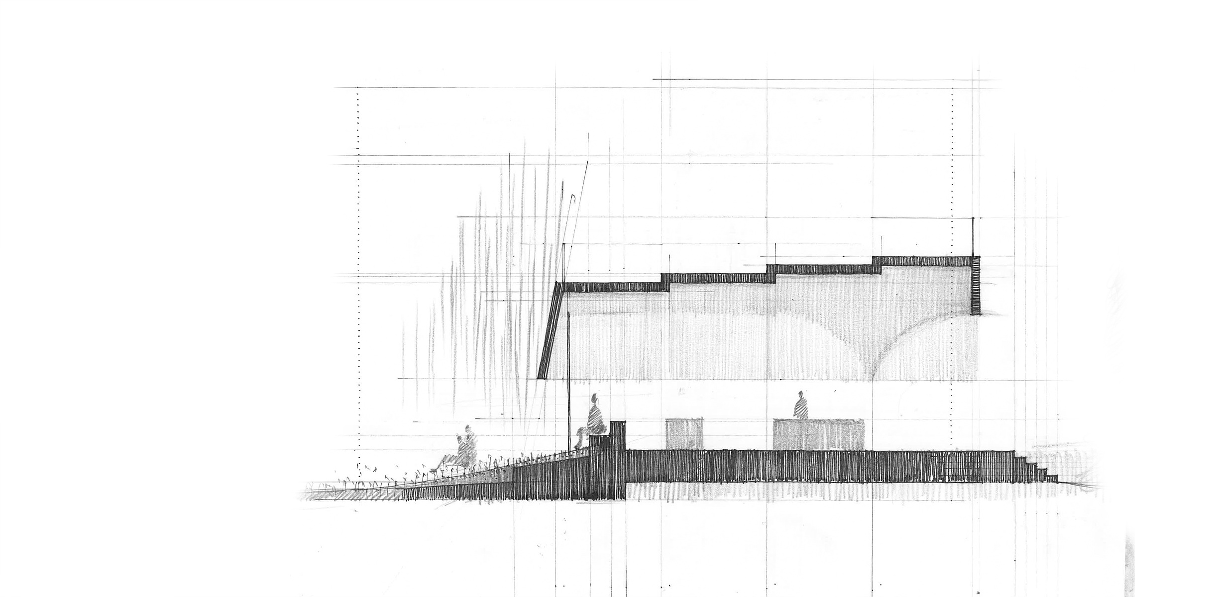 자연 빛의 양으로 북쪽 바다를 느끼는 태도와 남쪽 들판을 느끼는 감정을 상상해보았다. 수공간에서 솟아오른 매스의 일층 바닥은 지면보다 높다. 일층 내부에서 바다를 느끼려면 약간의 경사진 슬로프를 올라야 한다. 올라서 밟은 1층 바닥에서는 북쪽 바다의 선명하고 푸른 수평선이 펼쳐진다. 지면보다 살짝 올라온 높이에서 본 바다는 앞 도로의 차와 자전거 또는 도보를 걷는 사람들의 광경과 방해되지 않게 좋은 모습으로 겹쳐진다.