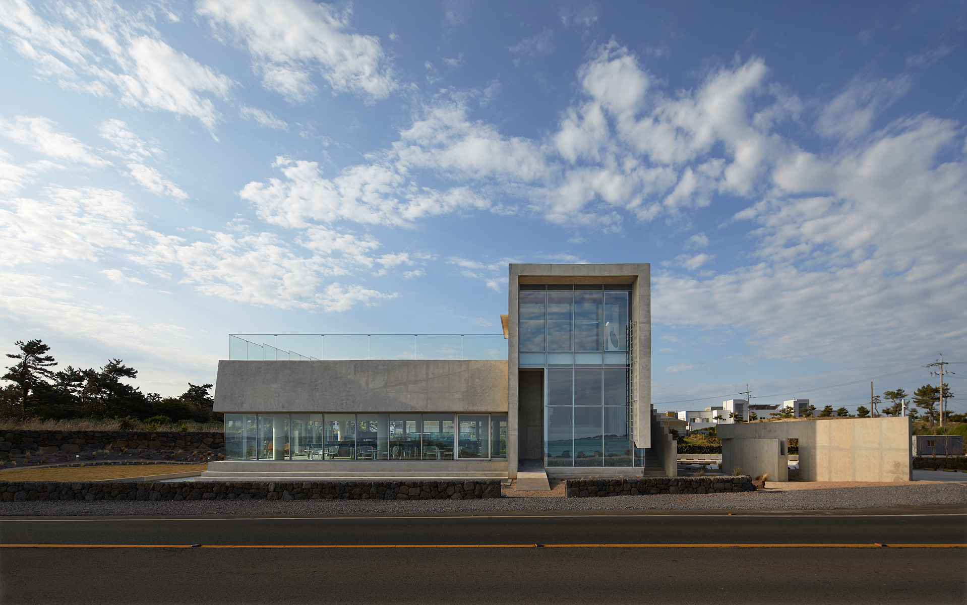 I imagined the attitude of feeling the northern sea with the amount of natural light and the feeling of feeling the southern field. The first floor of a mass rising from the water space is higher than the ground level. You have to climb a little slope to feel the sea inside the first floor. On the floor of the first floor, the clear blue horizon of the northern sea unfolds. Seen from a height slightly higher than the ground, the sea overlaps with the sight of cars on the road ahead, bicycles, or pedestrians, in a good way.