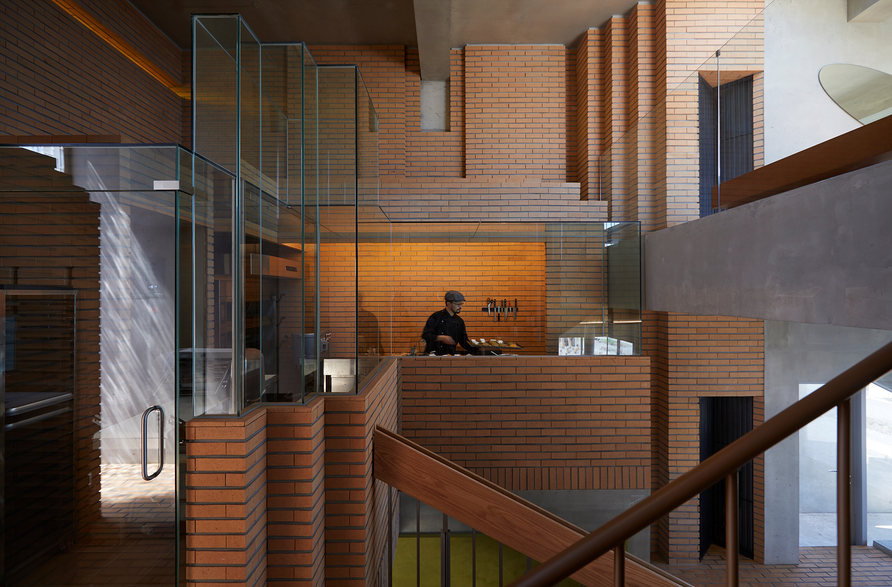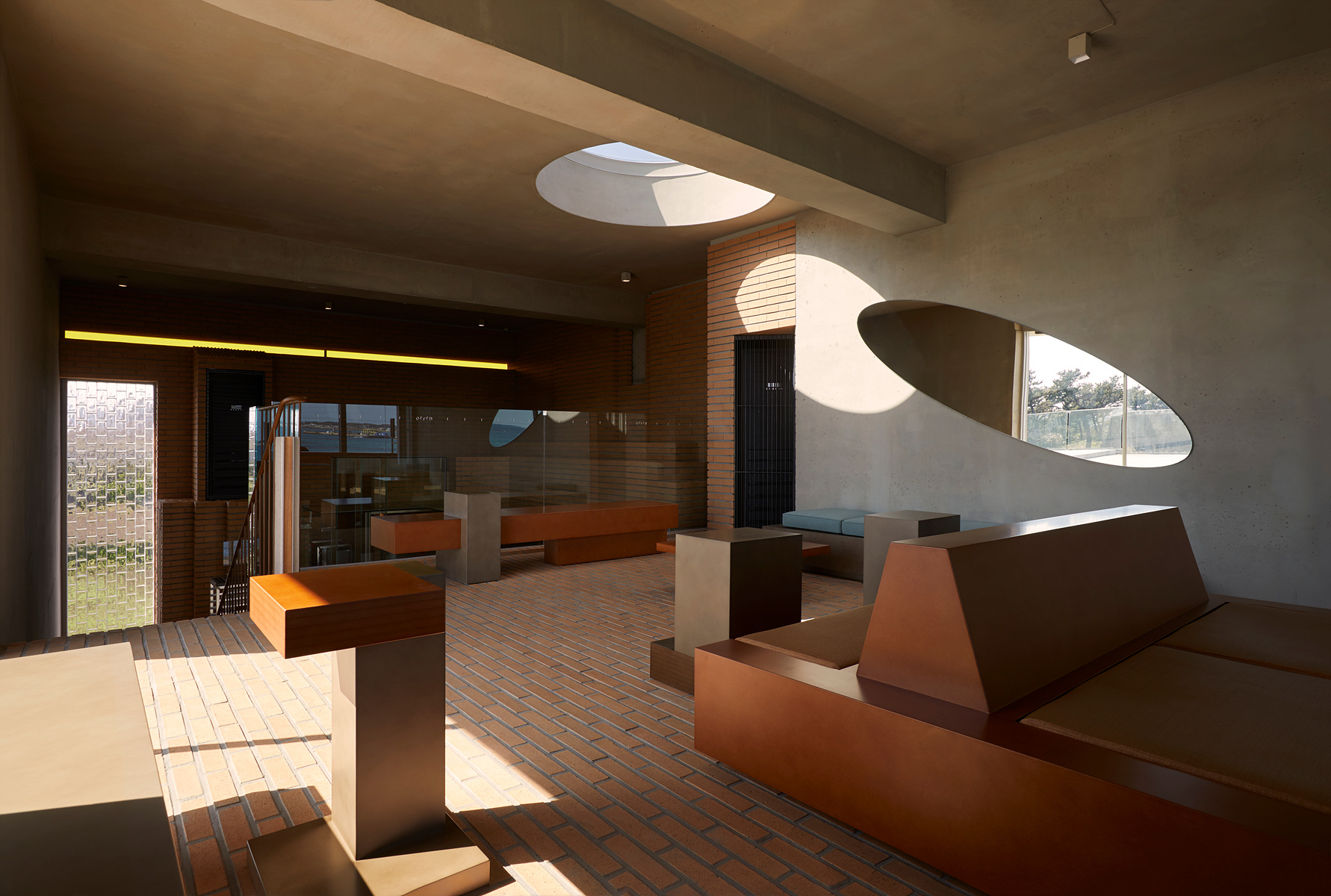 When you look at the building, it is divided into the left mass, which is the first floor structure, and the right mass, which is the second floor structure, and then goes up again to the right. The stairs were thought to be a volcanic island land (oreum), not a physical overcome to move to the second floor, and created a sequence of encounters with the surrounding nature as they climbed. On the 1.5th floor, where you can see the sea, there is an oreum staircase, and on the 0.5th floor, there is an unfamiliar concept bathroom surrounded by flowers that have bloomed on the ground from the beginning. On the 1.7th floor, a baking room is constructed by stacking bricks and climbing inside. When you climb up again and reach the second floor, the sea unfolds like a picture in a simple rectangle made by the wall.
