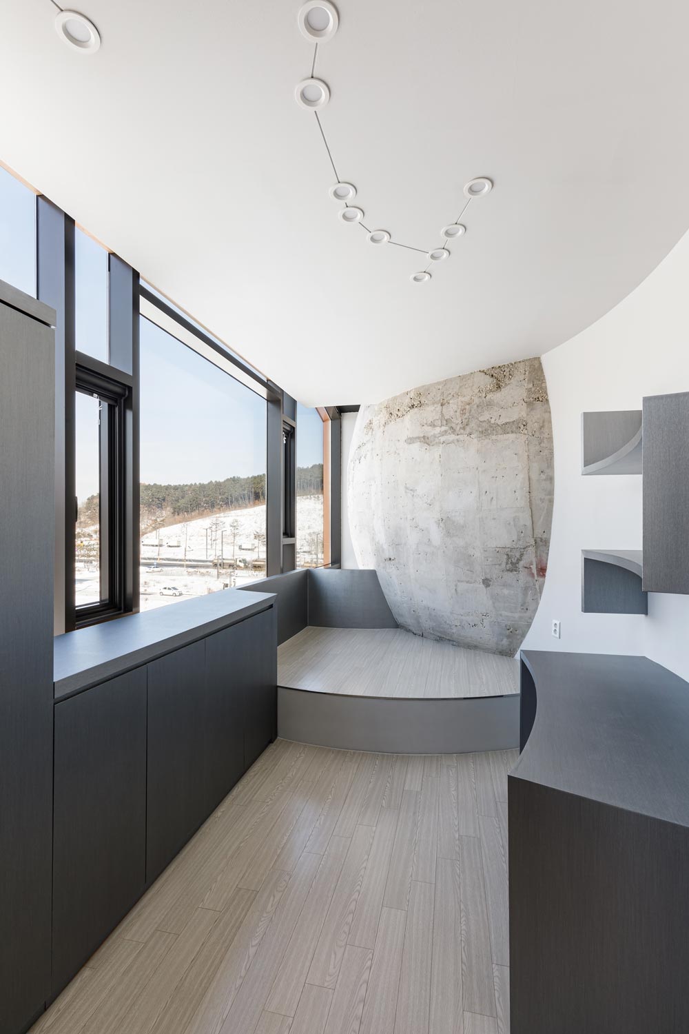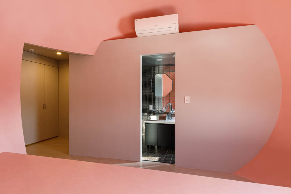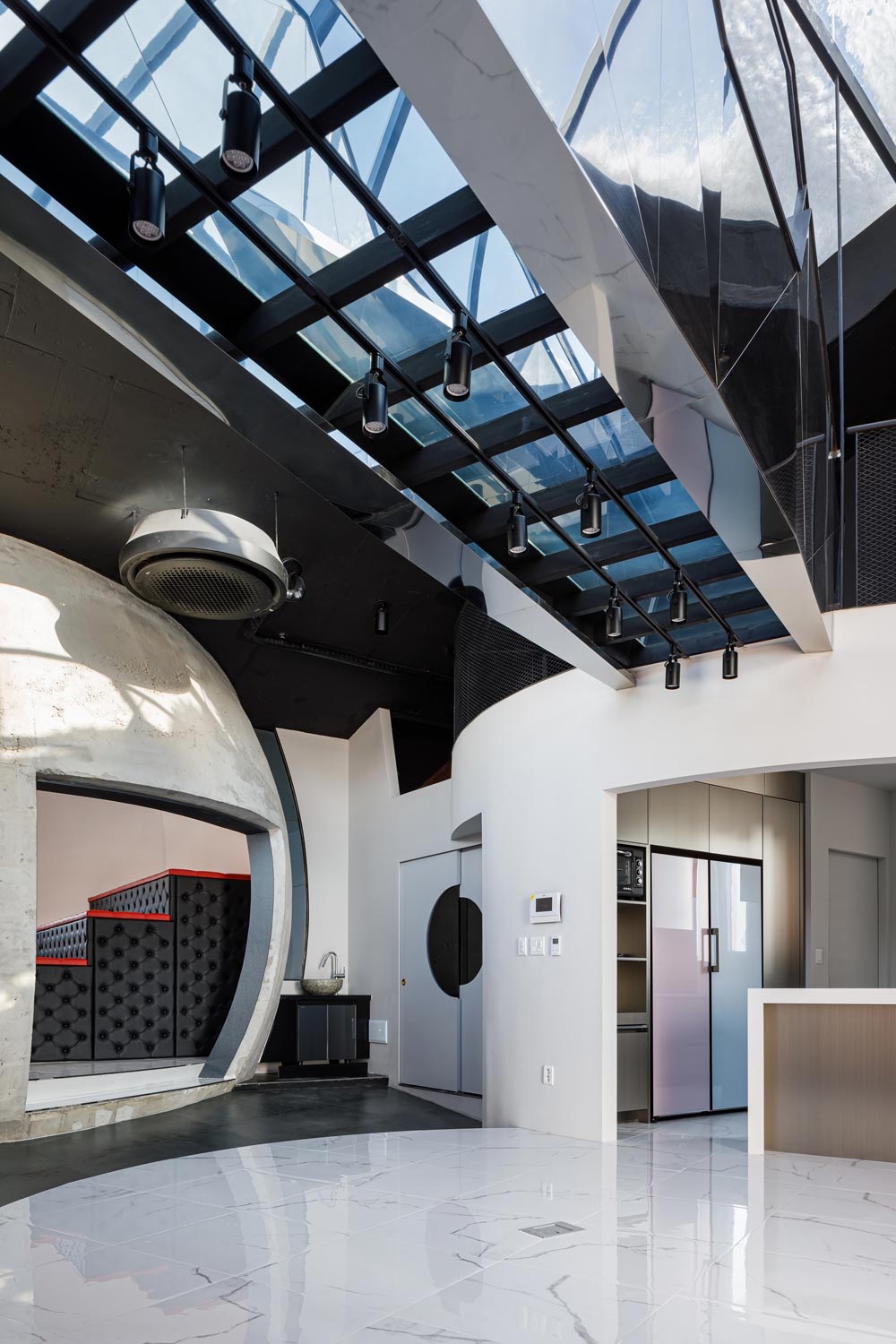 경사진 바닥 슬라브들은 여기저기 펼쳐져 있다. 다른 중력장에 와 있는 듯한 생각을 하듯이 말이다. 경사진 바닥과 경사진 지붕을 통해 다양하고 작은 레벨의 변화를 느껴본다. 1층에는 상업공간을 목표로 평평하고 직사각형 공간으로 이루어져 있고, 2층에 오르면 두 세대가 각자 다른 공간 형식을 이룬다. 3룸의 경우 다양한 레벨차와 더불어, 거실 공간이 실내이지만 마치 외부의 중정 마당처럼 계획됐다. 의뢰인 가족의 거주하는 3층 공간은 처음부터 소우주라는 아이디어로 기획되었다. 미니 판테온 혹은 불레의 공간을 상기시키는 구 공간이 거실 및 영화감상실로 존재하고, 안방 겸 침실 또한 구의 형태다. 식당 주방, 그리고 아이들 방마저, 원형의 행성처럼 각자 독립되어 있고, 그 사이 공간들은 레벨 차이로 구분된다. 어두운 원형 계단을 통해 다락 공간을 오르면, 그제야 투명 망토를 둘러 눈에 들어오지 않았던, 우주선 혹은 다리가 모습을 드러낸다.
