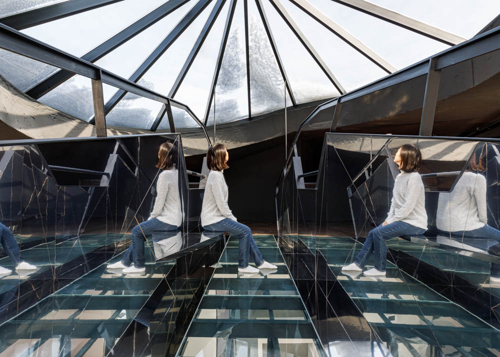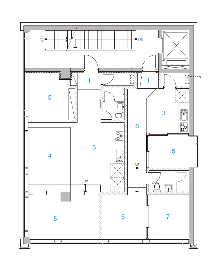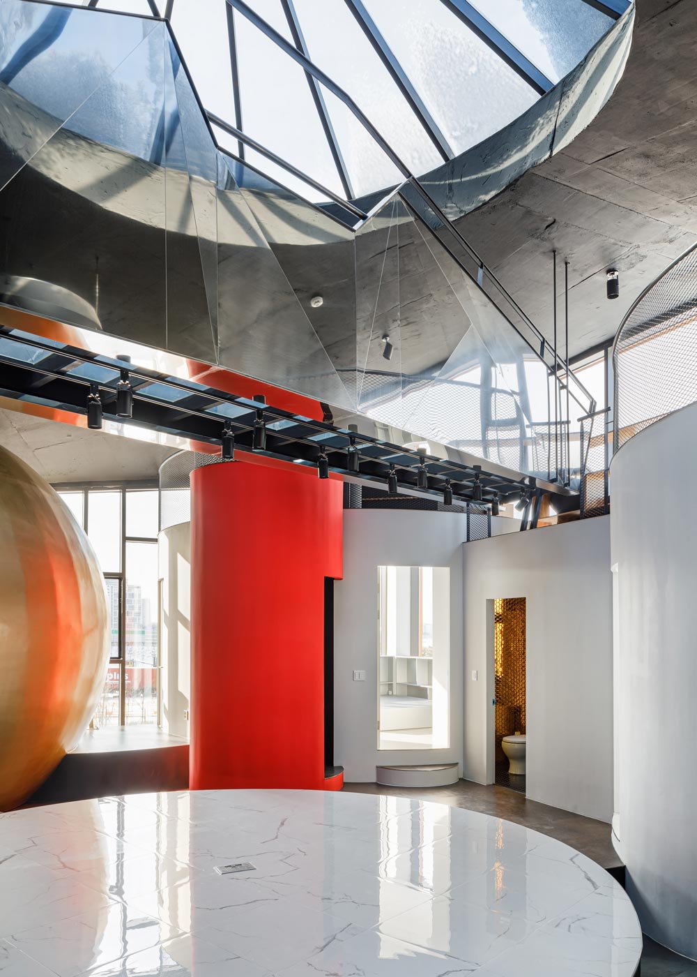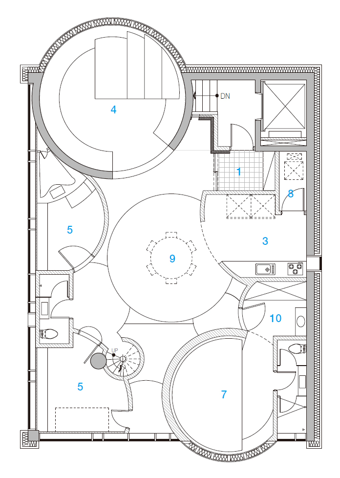 경사진 바닥 슬라브들은 여기저기 펼쳐져 있다. 다른 중력장에 와 있는 듯한 생각을 하듯이 말이다. 경사진 바닥과 경사진 지붕을 통해 다양하고 작은 레벨의 변화를 느껴본다. 1층에는 상업공간을 목표로 평평하고 직사각형 공간으로 이루어져 있고, 2층에 오르면 두 세대가 각자 다른 공간 형식을 이룬다. 3룸의 경우 다양한 레벨차와 더불어, 거실 공간이 실내이지만 마치 외부의 중정 마당처럼 계획됐다. 의뢰인 가족의 거주하는 3층 공간은 처음부터 소우주라는 아이디어로 기획되었다. 미니 판테온 혹은 불레의 공간을 상기시키는 구 공간이 거실 및 영화감상실로 존재하고, 안방 겸 침실 또한 구의 형태다. 식당 주방, 그리고 아이들 방마저, 원형의 행성처럼 각자 독립되어 있고, 그 사이 공간들은 레벨 차이로 구분된다. 어두운 원형 계단을 통해 다락 공간을 오르면, 그제야 투명 망토를 둘러 눈에 들어오지 않았던, 우주선 혹은 다리가 모습을 드러낸다.