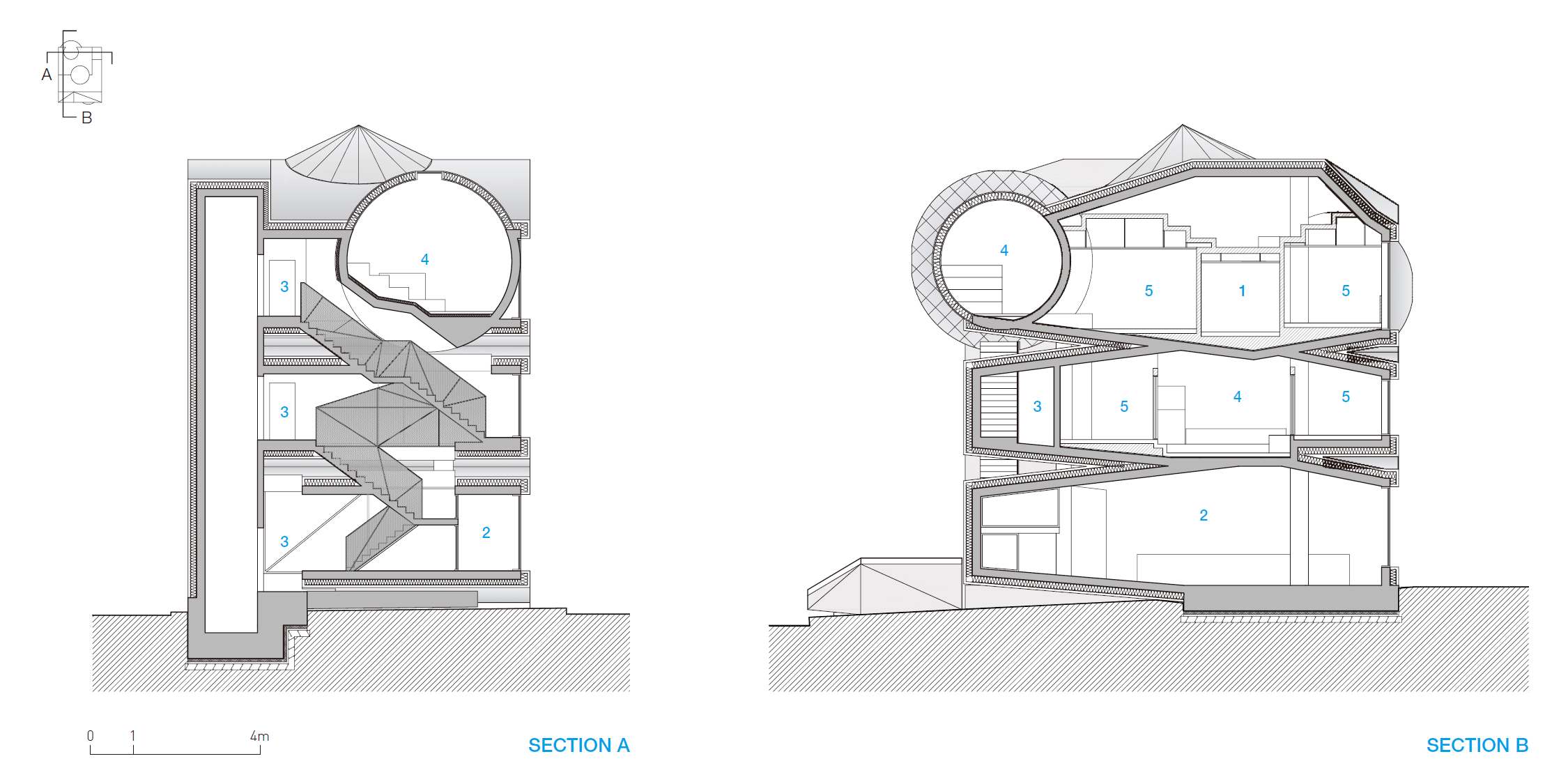 The 2nd, and 3rd floor slab, which are also the roof of 1st floor and 2nd floor respectively are not flat but angled and folded, which is very uncommon in general architecture. It strives to provide two things, firstly dynamic spatial experience beyond the rectangular box, in spite of being in the vertically stacked space, secondly providing illusory spatial experience, where folded floors, provide false sensation of gravity. The Sphere space on the 3rd floor mimics mini Pantheons or Boulle’s Spheres, which provide extra ordinary spatial experiences, within the context of a house.