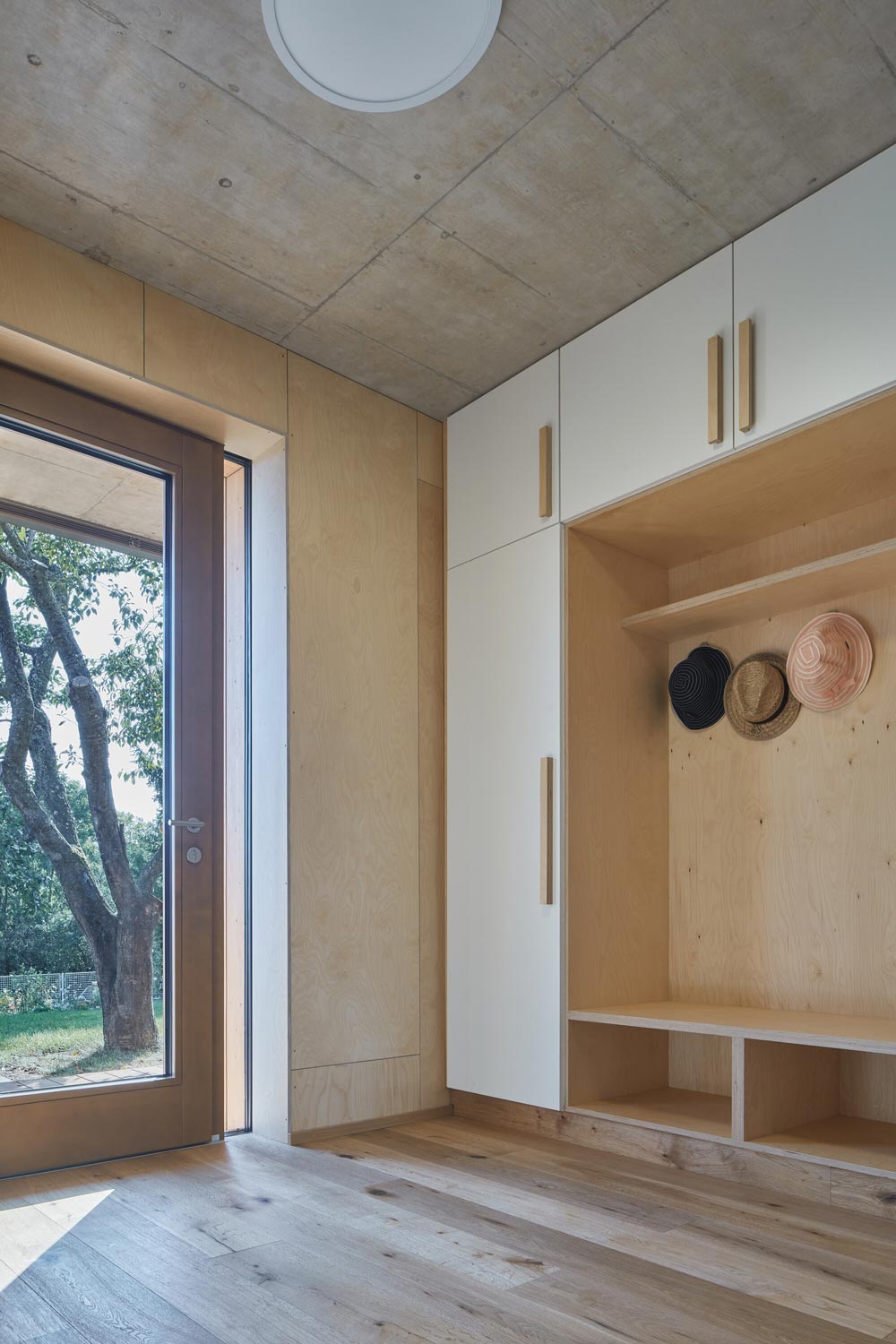 디자이너는 집에서 지역의 가장 좋은 전망을 얻기 위해 집을 가능한 한 높게 배치하려고 했고, 그러면서 이웃 건물(사생활)도 고려했으며, 대지에 오래된 나무 한 그루도 염두에 두고 있었다. 그 결과, 집을 대지의 한가운데에 두기로 결정했고, 동시에 남부의 햇볕이 잘 드는 과수원과 북부의 그늘진 숲이라는 두 개의 정원을 만들기로 했다. 주택의 1층은 세라믹 블록(외부 단열 없음)과 칸막이로 된 견고한 재질로 만들어졌으며 콘크리트 천장(안전한 느낌)으로 덮여 있다. 1층 지붕은 정원으로, 나비가 있는 초원으로 설계되었다. 그 위에는 십대 아이들을 위한 공간으로 가벼운 나무 창고/헛간이 있다.