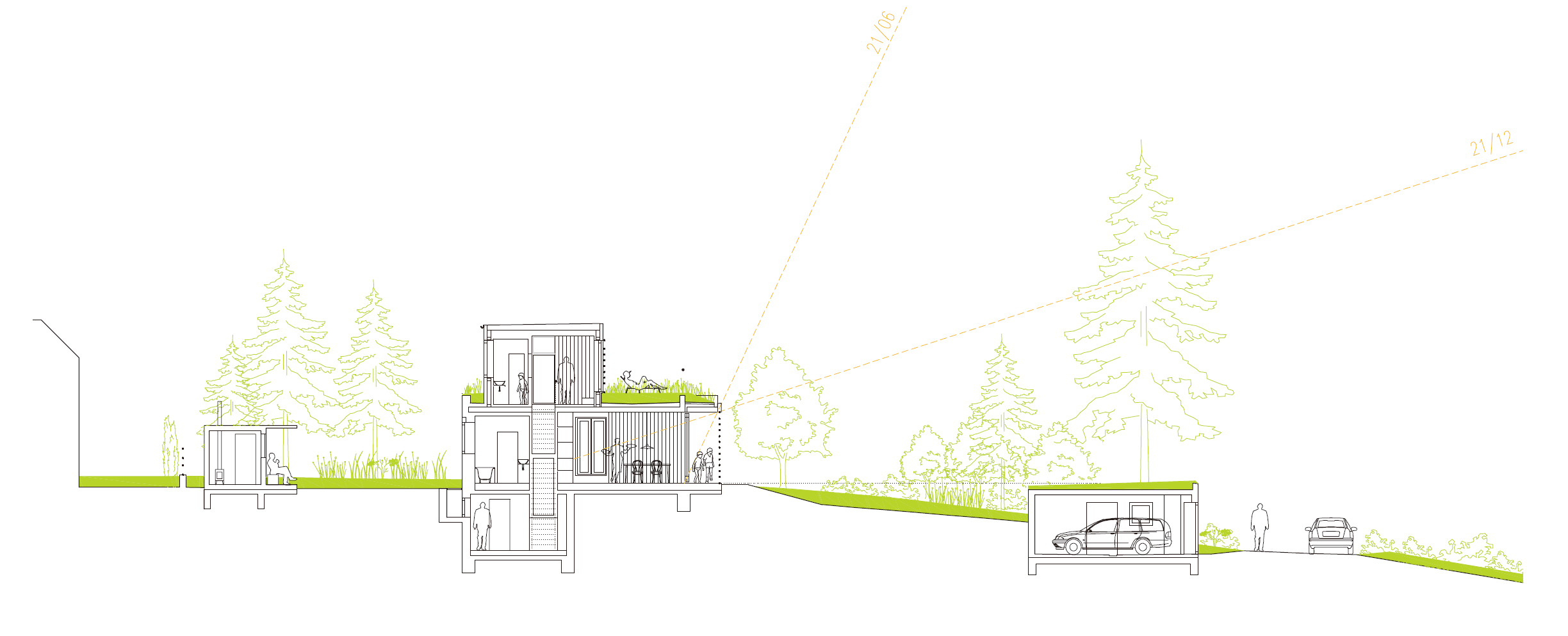 이 프로젝트는 4인 가족을 위한 집으로 계획됐다. 건축주는 주변의 집과 오래된 정원의 나무들 사이에 이 집이 완만하게 들어맞아 경관과 천연자원을 활용할 수 있기를 원했다.