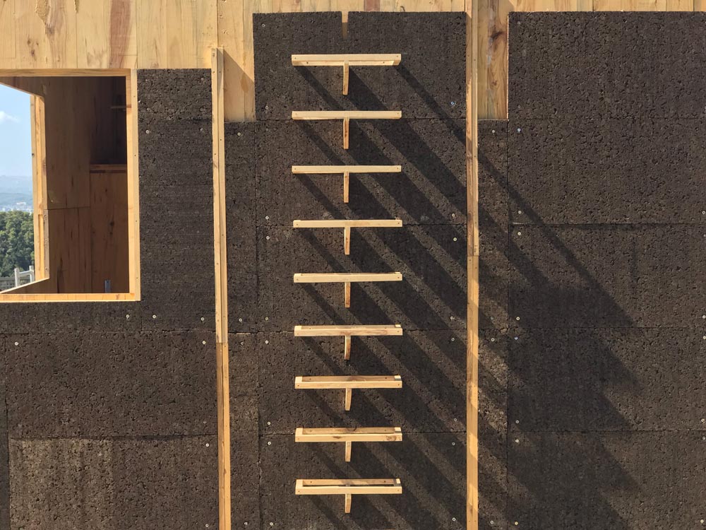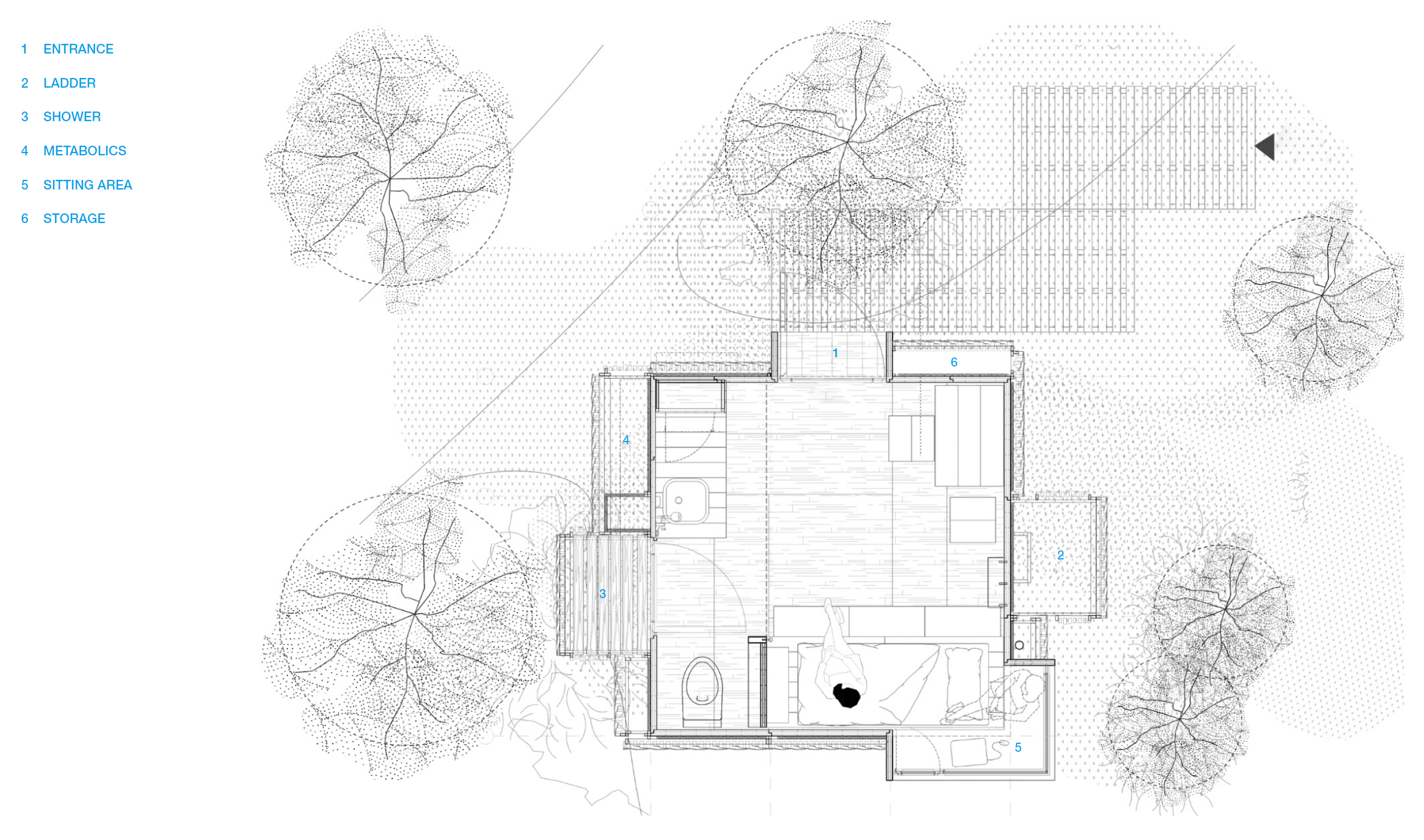 By advancing the design a step further, each off-cut was parametrically organized into a gradient that corresponds to functions within the cabin. Certain sections of the skin also extrude away from the cabin corresponding to metabolic components like water tanks and an outdoor shower. The roof of the cabin features a series of garden boxes with elaborate joints milled with computer-numerical-control (CNC) machinery (no screws, no glue), which holds a variety of local plants and funnel rainwater into a collection tank below.
