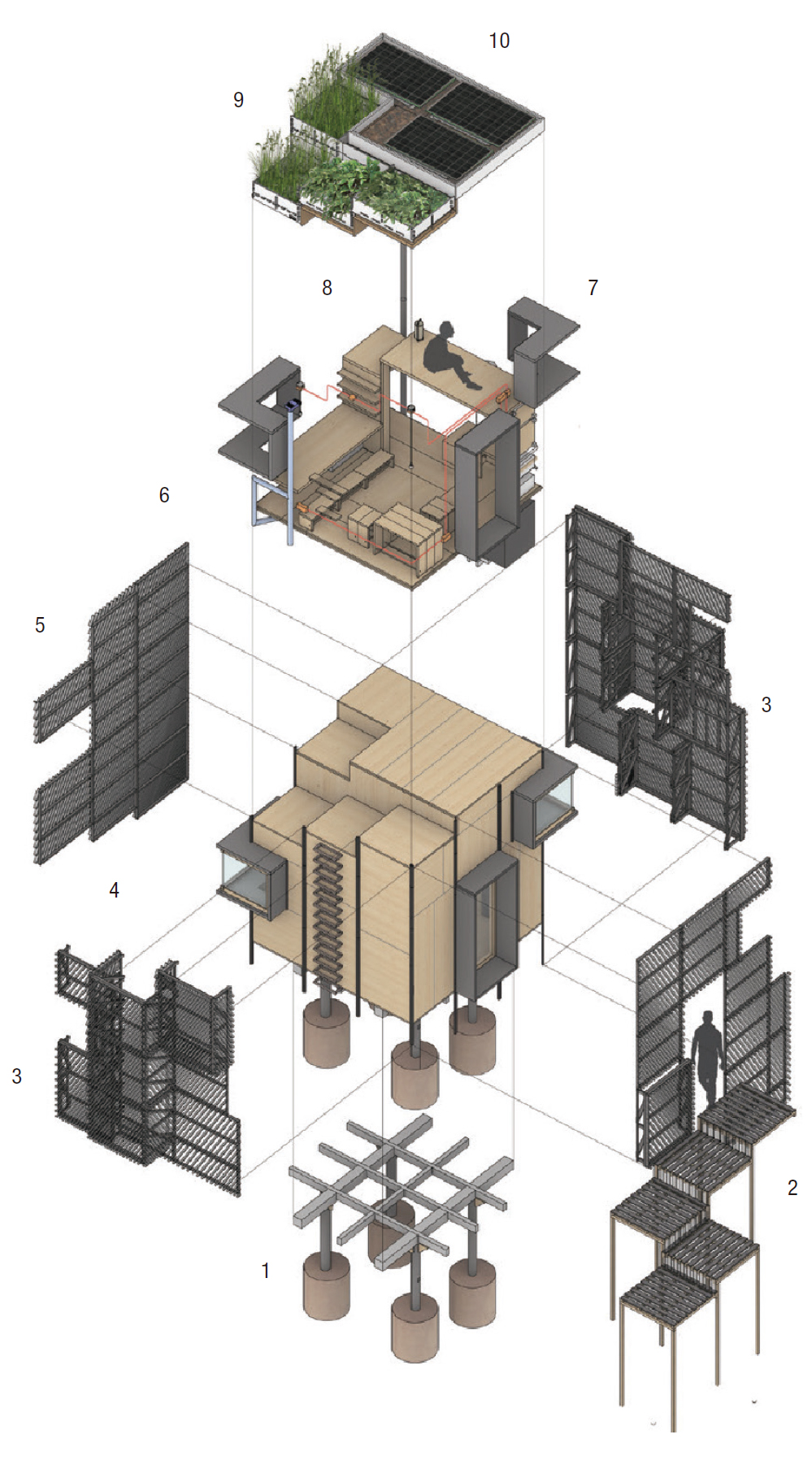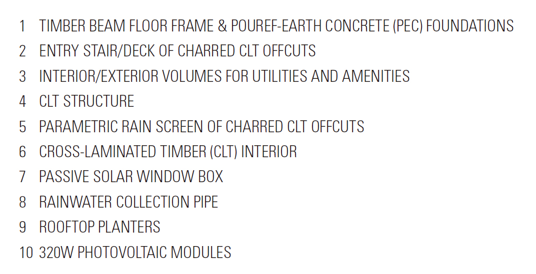 프로젝트의 원자재는 40개의 소나무들로부터 공급됐으며, 3cm 보드로 절단되어 3개월 동안 건조됐다. 건조된 보드는 발다우라 랩으로 이송됐으며 목공품들은 수백 개의 소나무판들로 공정됐다. 그 후 각 합판들은 특정한 순서로 암호화되고 표시되고, 3.6x3.6m 정육면체로 조립되는 30개가 넘는 구조 CLT 패널로 압착됐다. 건축물의 재료 흐름에 대한 이해와 함께 모든 패널들의 얇은 막들은 집의 모든 단일 목재 요소들이 디자인을 한 단계 더 개선함으로써 각 자투리들은 매개변수에 의해 오두막 내 기능들에 상응한다. 파사드의 특정 부분은 물탱크와 야외 샤워실과 같은 공간 구성에 따라 돌출되거나 삽입됐다. 오두막의 지붕은 컴퓨터 수조절(CNC) 기계(못, 풀 사용하지 않음)로 가공된 정교한 접합부를 가지며, 다양한 현지 식물들을 고정하고 하단의 탱크로 빗물을 이동시키는 정원 상자의 연속을 특징으로 한다.
