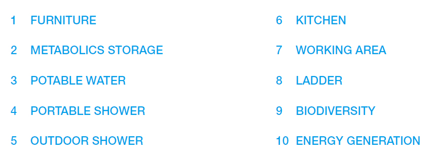 오두막엔 세 개의 태양광 패널과 특히 단일 거주민을 위한 빛과 기기에 전력을 공급하기 위해 설계된 독립된 배터리 저장고도 설치되어 있다. 수도 시스템은 요리 혹은 난방 시 사용 가능한 연료와 부산물로 위생 비료를 생성해 주는 자족적 바이오 가스 시스템 내 흑수 처치는 물론, 빗물 수집과 회색수를 재사용할 수도 있다. 복셀은 특정지역에 국한된 재료들과 산업화된 기술들로 생태적인 건축 패러다임의 본능적인 증거인 것이다.
