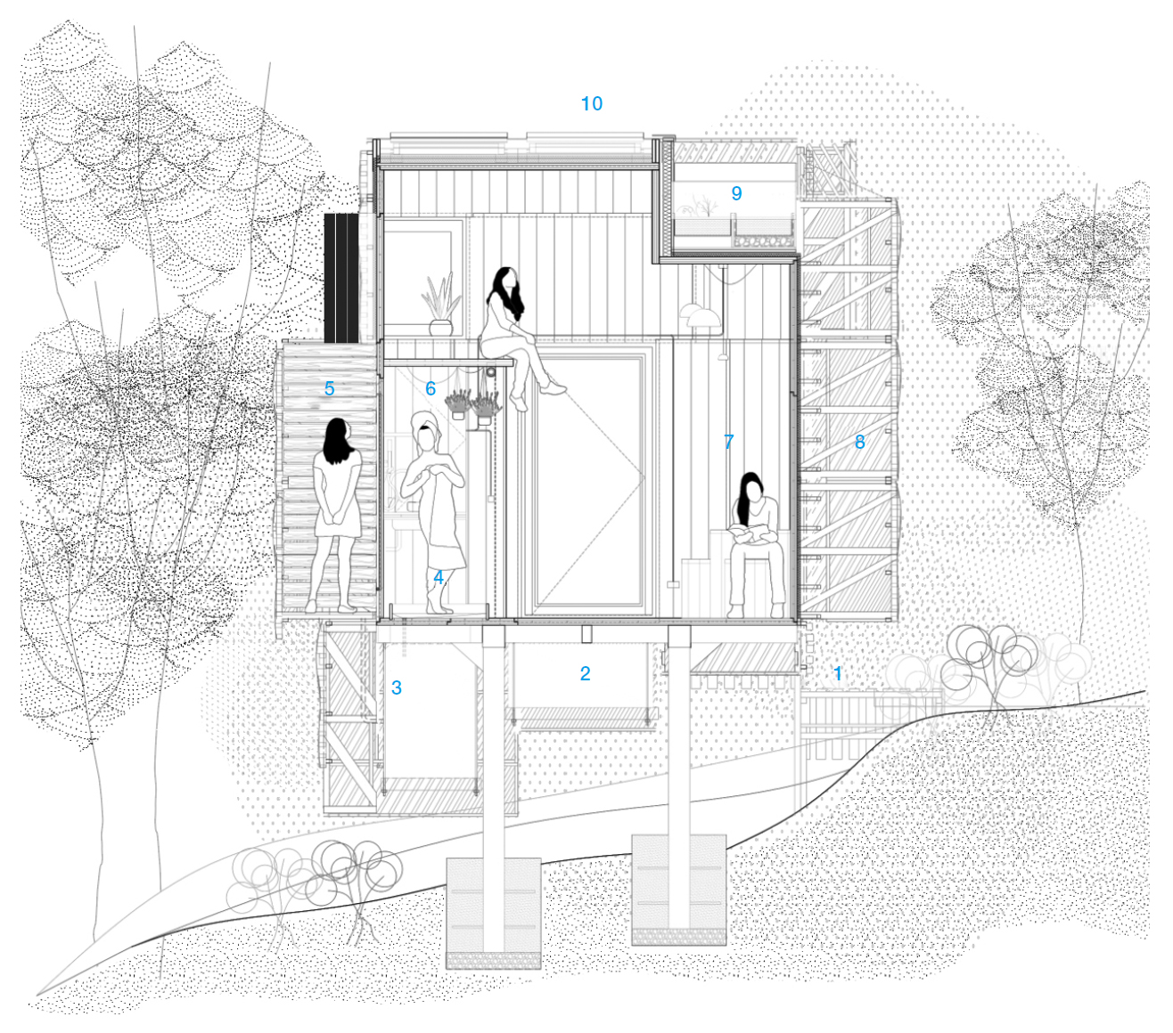 The Collserola natural park, in the surroundings of Barcelona, is the setting for The Voxel project, produced by a team made up of students, professionals and experts from the Master in Advanced Ecological Buildings and Biocities (MAEBB) of the Institute of Advanced Architecture of Catalonia (IAAC) Valldaura Labs. Designed as a quarantine cabin, the house can accommodate one occupant for 14 days, providing all material needs during self-confinement.