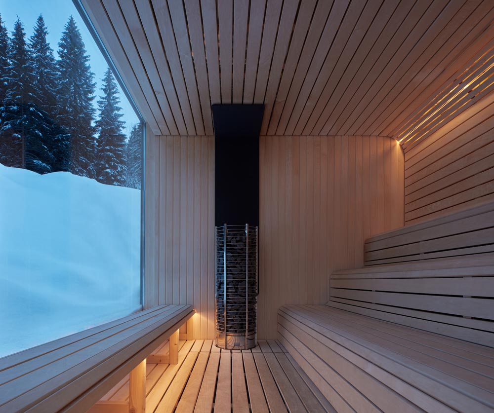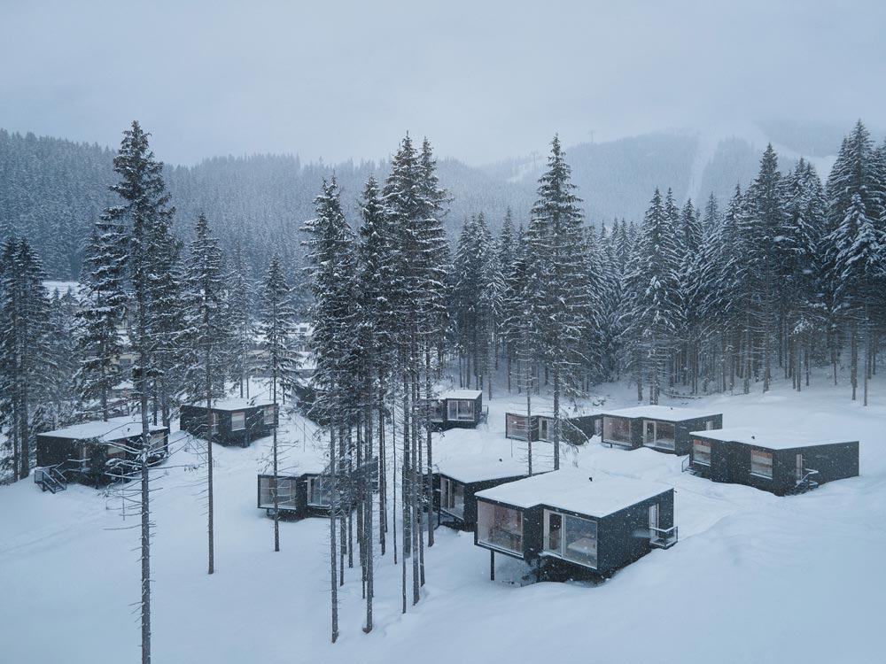Guests find themselves in the forest and at the same time in the middle of the ski resort Jasná thanks to the disposition of the modules which ensure privacy and peace within arm’s reach of the main hotel building. We also designed an extension of the hotel’s restaurant and a forest wellness built from four Ark-shelter modules that form a cluster of saunas and relaxation rooms with a masseur.