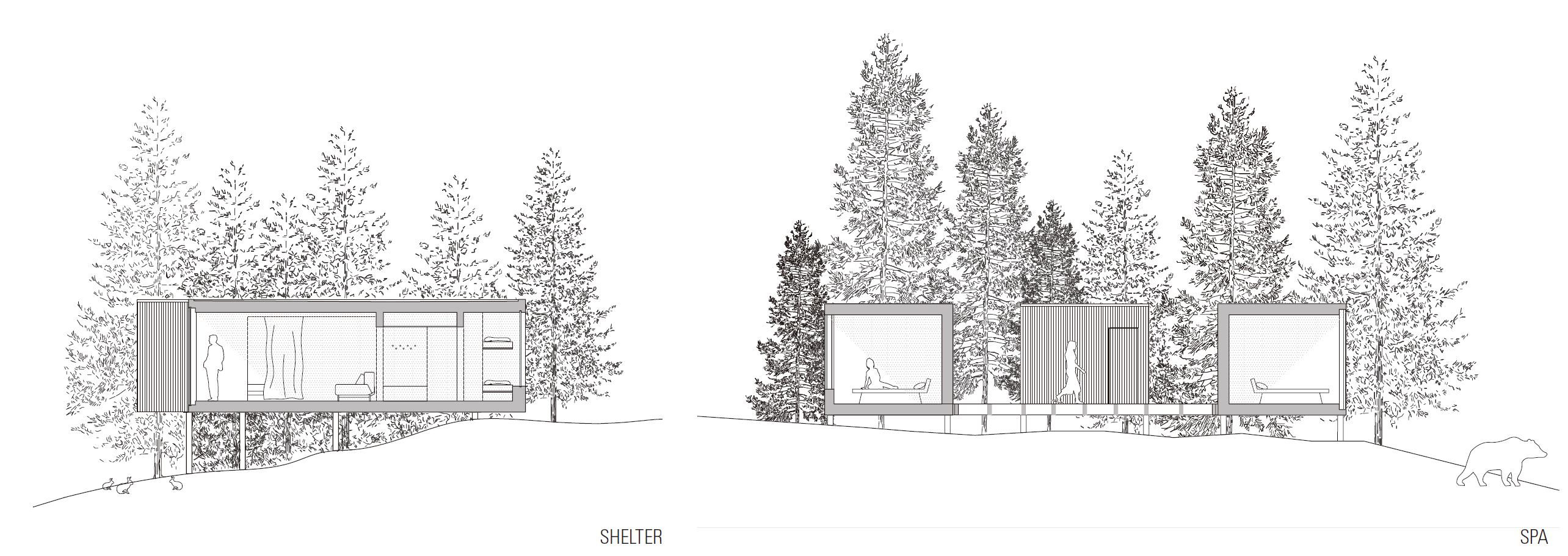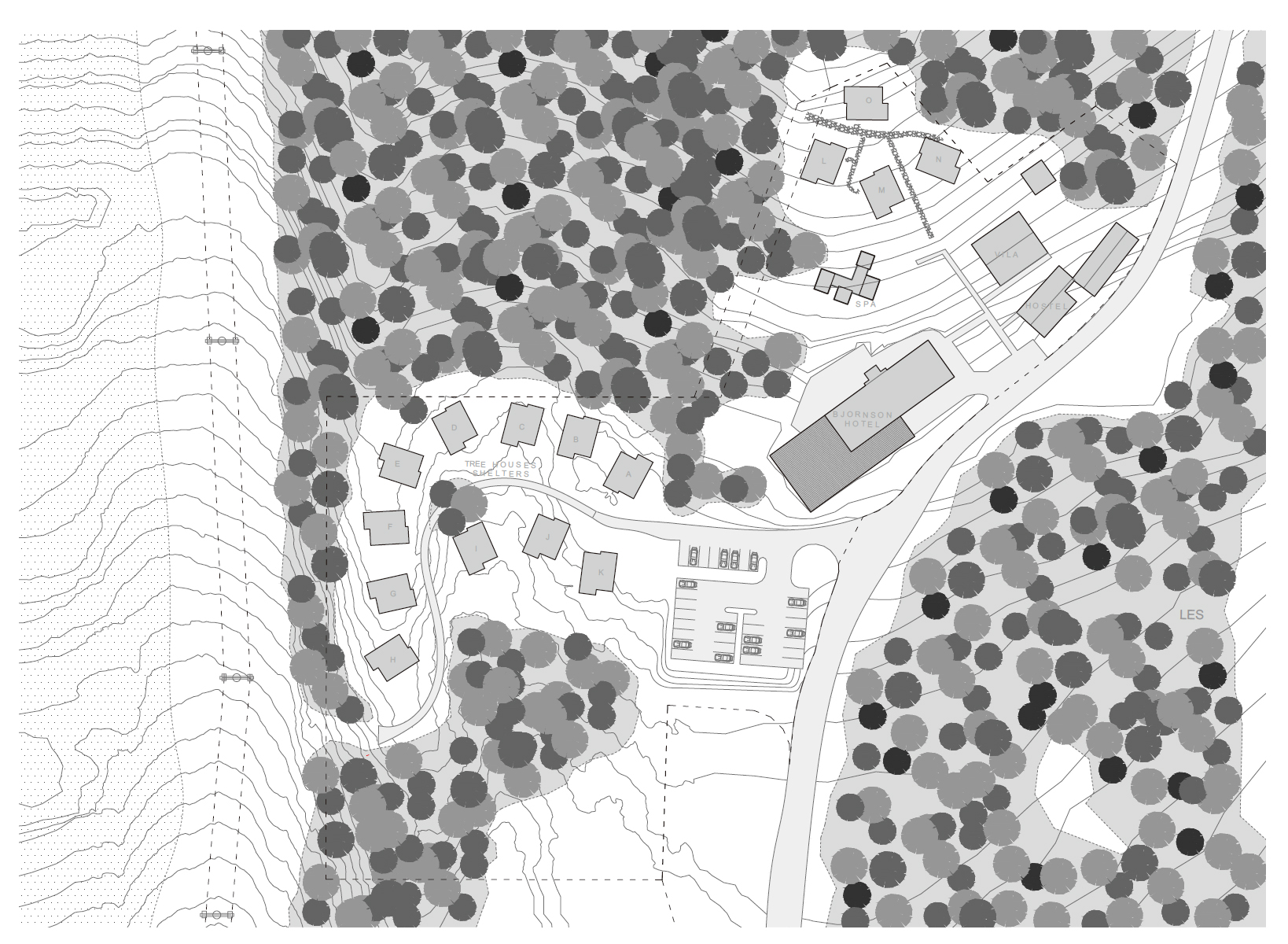 호텔 비욘슨은 숲속 작은 휴양용 주거 단지다. 메인 호텔 건물 주변 지역에 한 방향을 향하는 두 개의 오두막이었다. 우리는 나무들 사이에 단순히 공간을 배치하는 개념보다는 더 나아간 보존의 의미를 따져본다. 나무를 보존시키는 행위에서 생태적인 것이 아니라 클래식한 콘크리트 판을 대지에 놓는 것부터 이러한 공간들이 기둥에서 자라는 것까지 땅과 최소한으로 접촉된다는 점에서 생태적이라고 할 수 있다. 이는 박스 형태의 공간 아래, 놓여있는 작은 생활공간을 만들고, 공간들 아래로 계속해서 흐르고 변화하는 풍경과 함께 숨 쉬도록 만든다.