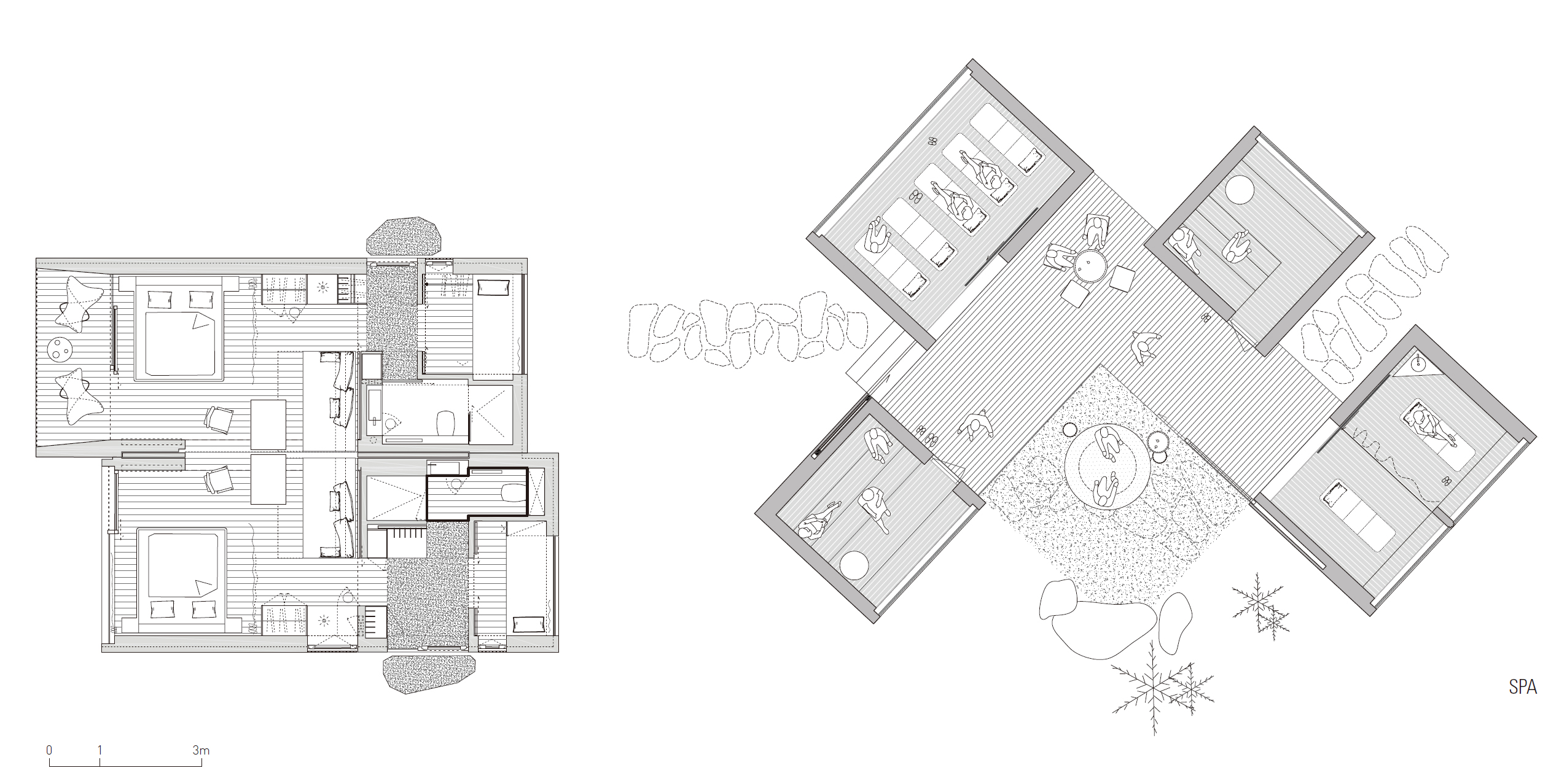 Cottages are placed in the forest, facing away from each other into the undisturbed scenes of the forest or the ski slope. It is the immediate contact with the ski slope that creates the unique atmosphere of the resort.