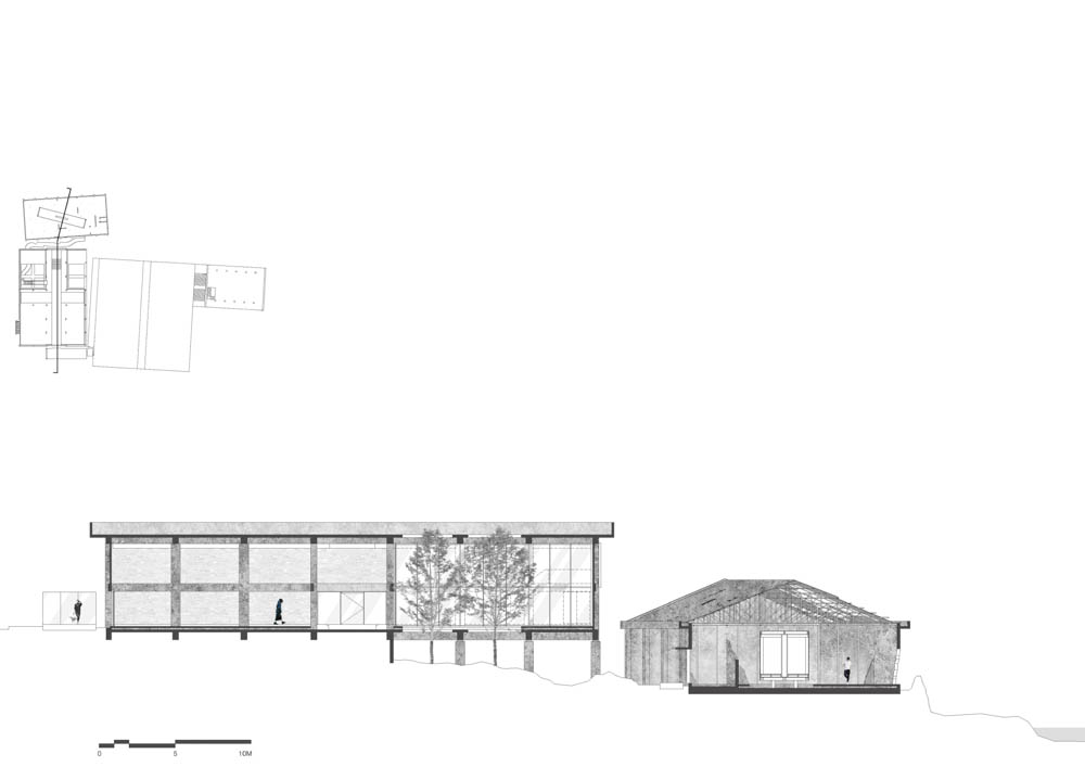 The site is located at the end of Dongbok-ri, a village on the northeast coast of Jeju Island. Two warehouses were inadvertently located in the landscape on the coastal hill, where trees and wild grass grew up toward the land due to unusually strong winds. The architect was fascinated by the silence when he first met the ruins, which had been left unattended for many years after being built as a freezer in 1982.