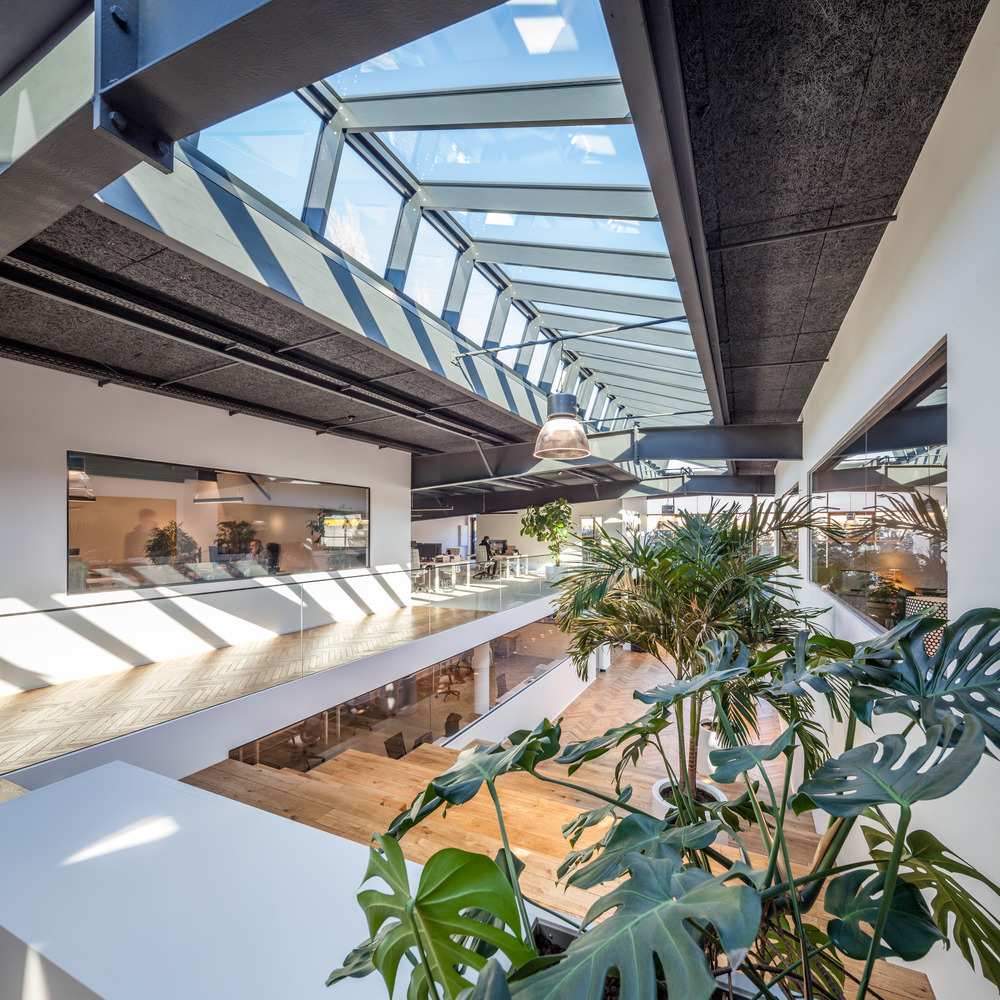 As you enter the space you are welcomed by a bright, double-height reception area. Light filters through from the large bay windows and from the skylights set into the steel roof. The overhaul included entirely gutting and renovating the feature skylights.