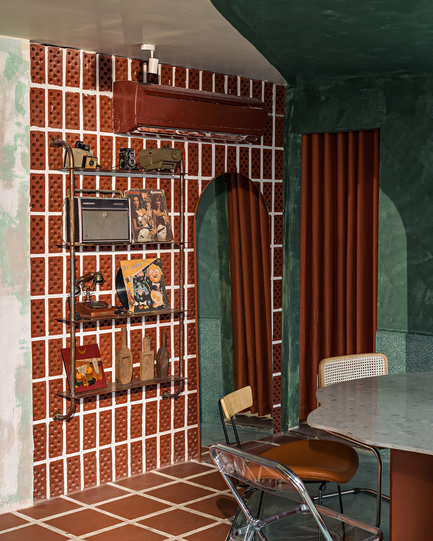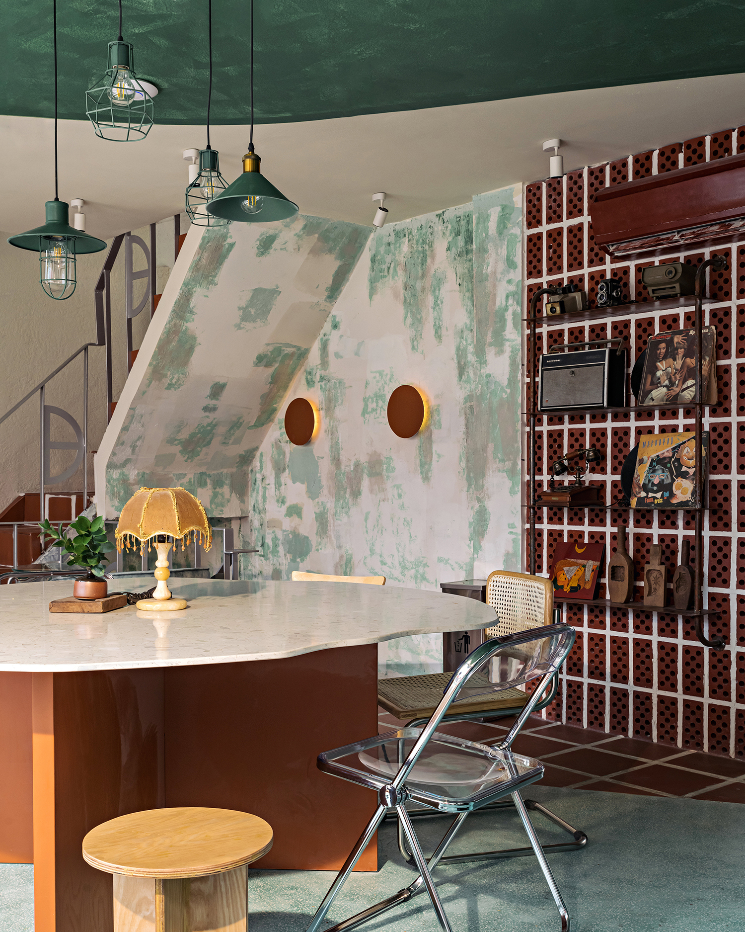 An example could be the green-coated walls which recall the old house vibes, accompanied by round-shaped inox led cases - which are painted orange that have demonstrated the interference of oldschool and newschool styles.