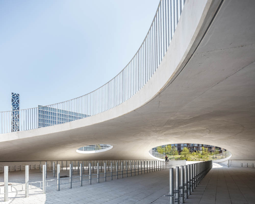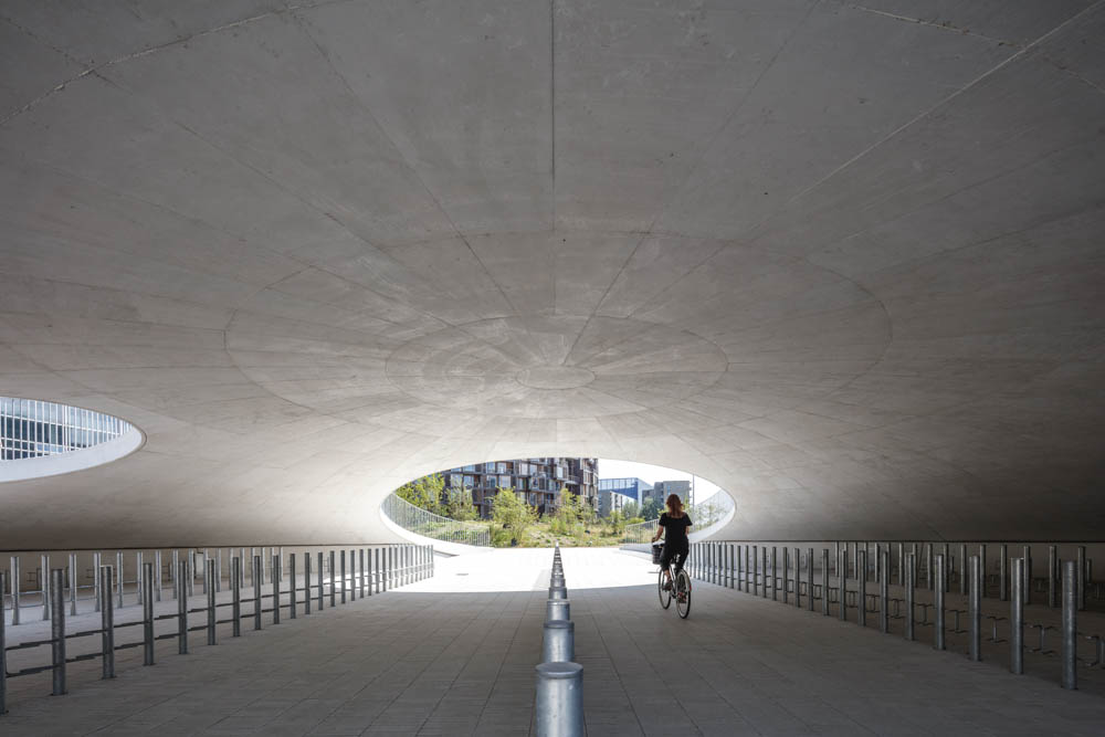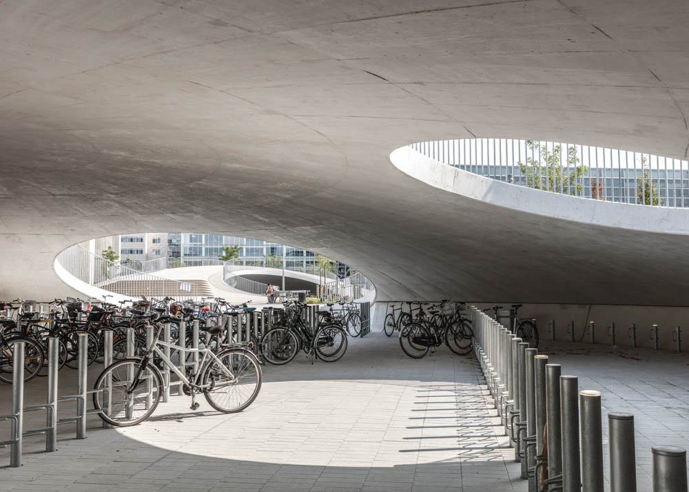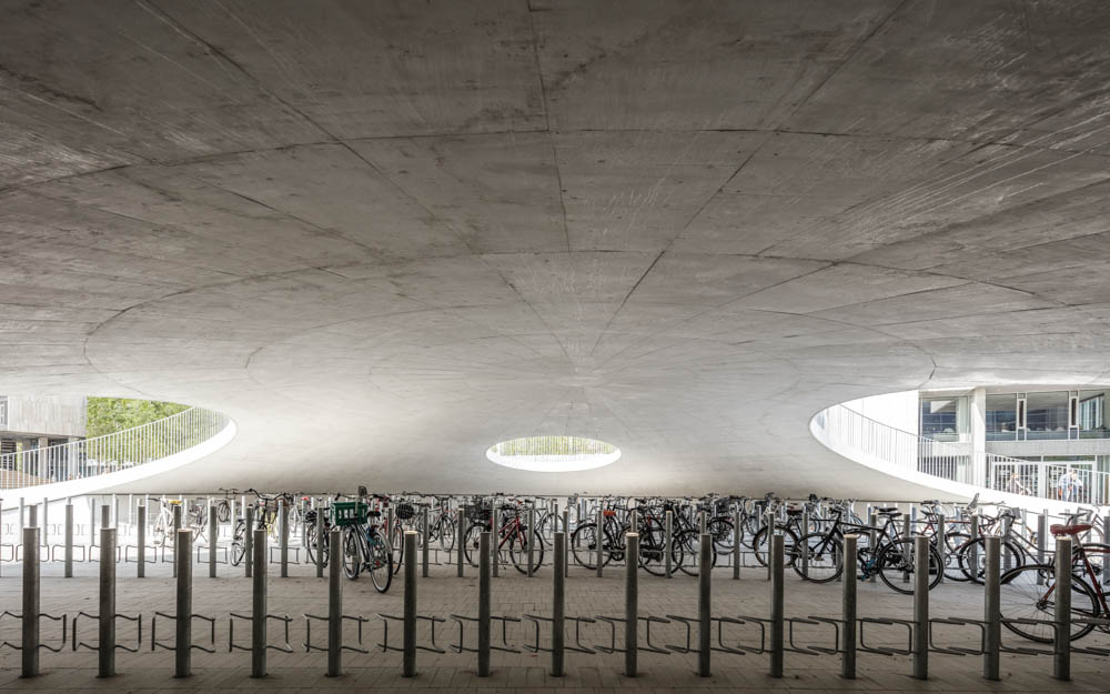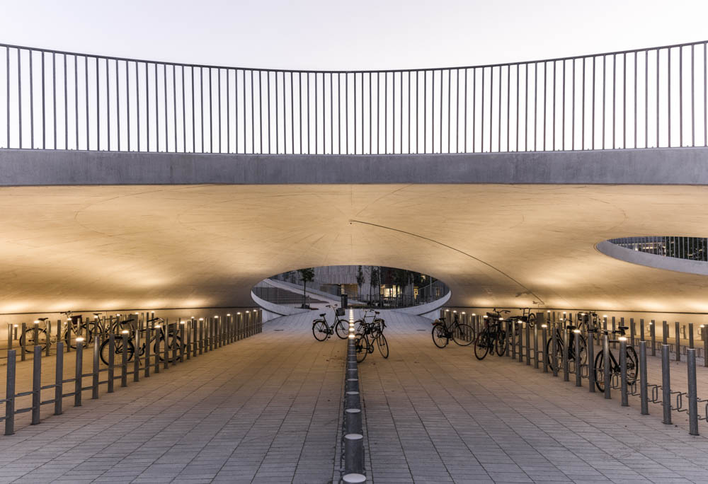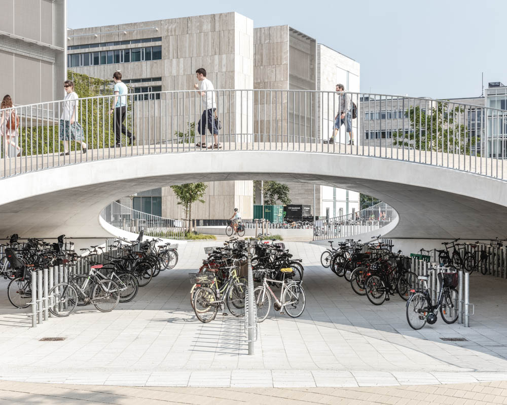 The three bicycle hills were created as cast concrete shells clad with hand-laid tiles in colours echoing the exteriors of the surrounding university buildings. In addition to serving as an active meeting place for students, employees and locals, the square also contains a high-capacity bicycle parking space for the many users of the university, including 16,000 students and 2,000 employees. The innovative and unique design has room for more than 2,000 parked bicycles. In a soft transition, Karen Blixens Plads brings together the university’s need for urban spaces with the open landscape of the neighbouring commons. The north side of the square, where the three main entrances to the university are located, is an open and multi-purpose space. To the south, hilly, undulating meadowland connects the campus with the commons.