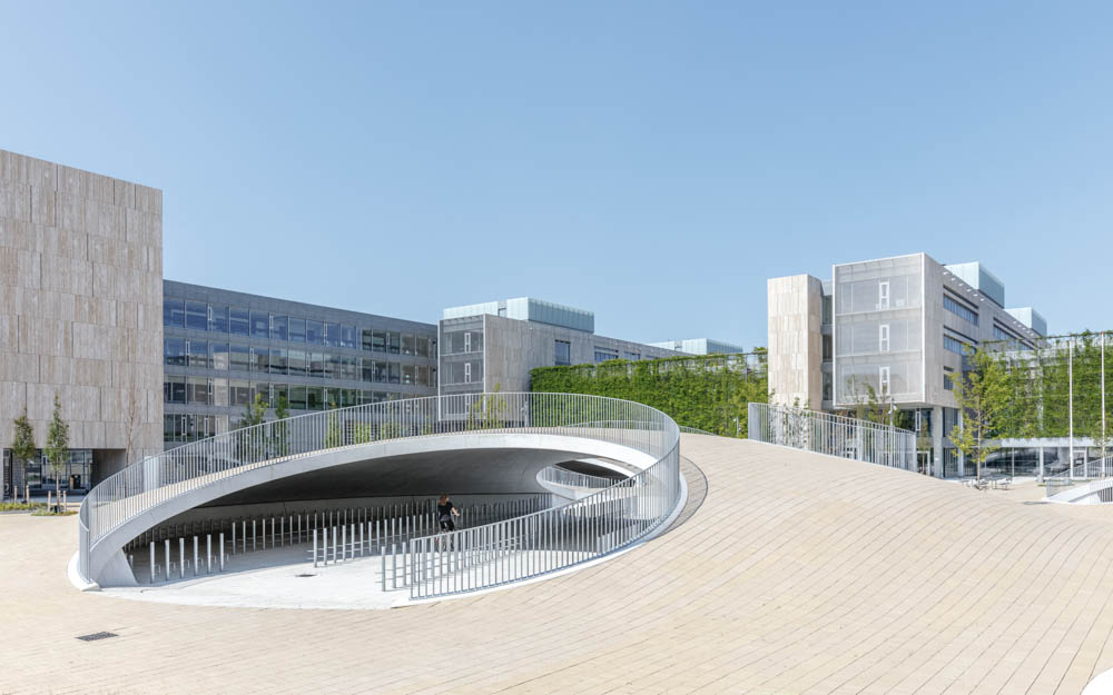 자연을 캠퍼스로 끌어들여오는 것 외에도 조경의 일부는 우수 처리를 도와 기후 변화 적응에 기여하기도 한다. 조경의 움푹 팬 곳에서 빗물의 배수를 지연시키는 것은 물의 순환이용 가치를 활용하고 생물 다양성을 지원하며 빗물 증발을 가능케 하여 극심한 강수량의 경우 운하를 보충하여 기후 변화 적응에 기여하는 작은 습식 비오톱을 생성한다. 디자인은 지속 가능한 도시 공간을 보장하기 위해 조명과 가구가 몇 가지 간단한 요소로 유지되는 것처럼 단순하고 견고한 내구성 재료가 사용됐으며, 선택한 모든 요소는 유지 관리가 용이하다. 또한, 이렇게 조성된 인공 언덕은 1,000명까지 앉을 수 있는 야외 강당이 되기도 하며, 언덕 윗부분에서 콘서트나 다른 대규모 공공 행사를 열 수도 있다.