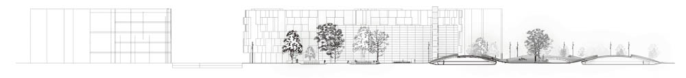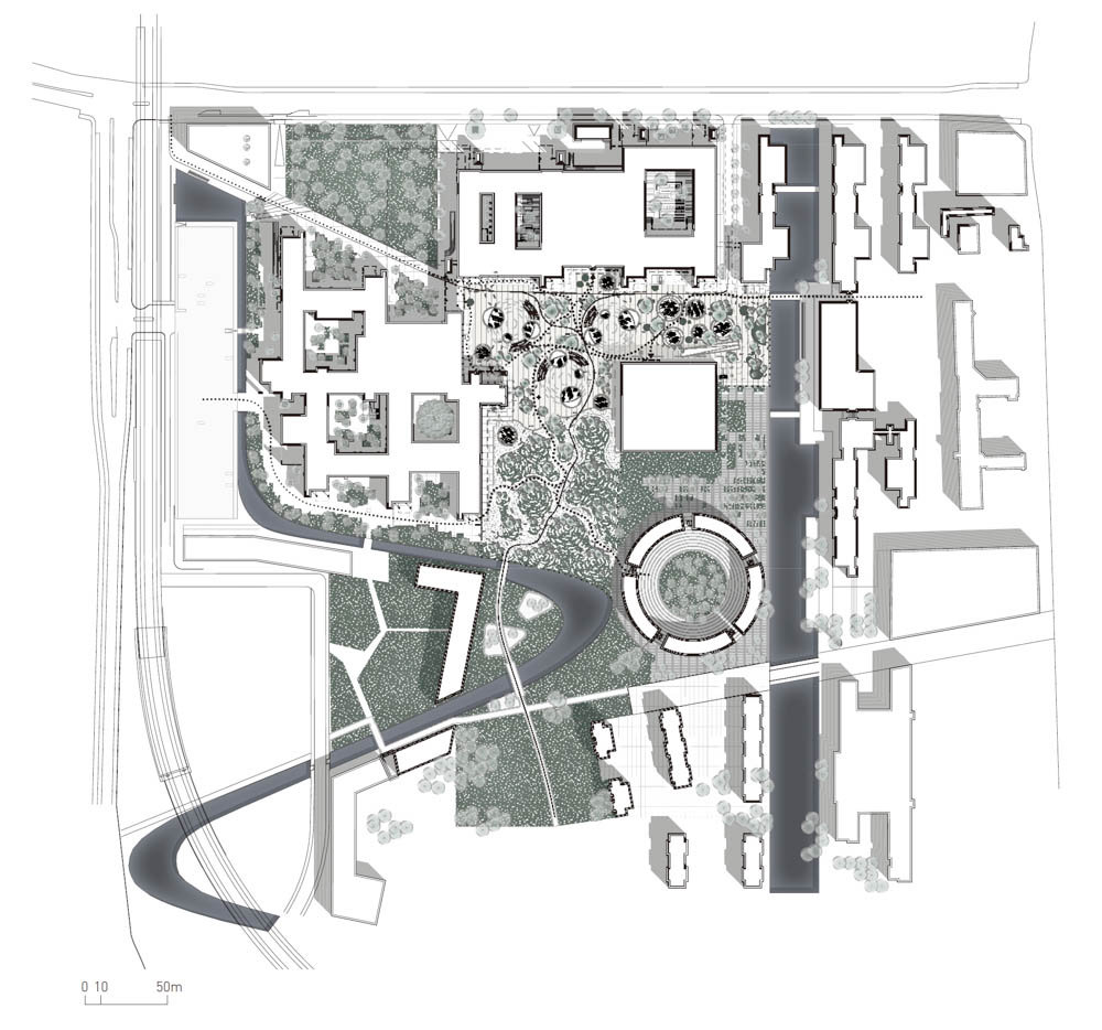 복합 공공 광장과 대학 광장은 작은 언덕의 굴곡진 지형을 커버하고 넓은 공간을 작은 구역으로 분할하여 언덕 위나 안에서 활동할 수 있는 둥글게 부푼 카펫 같다. 세 개의 언덕은 주변 대학 건물의 외관과 비슷한 톤으로 맞춰졌으며 콘크리트로 만들어진 셸 구조를 모두 수공 타일로 덮고 있다.