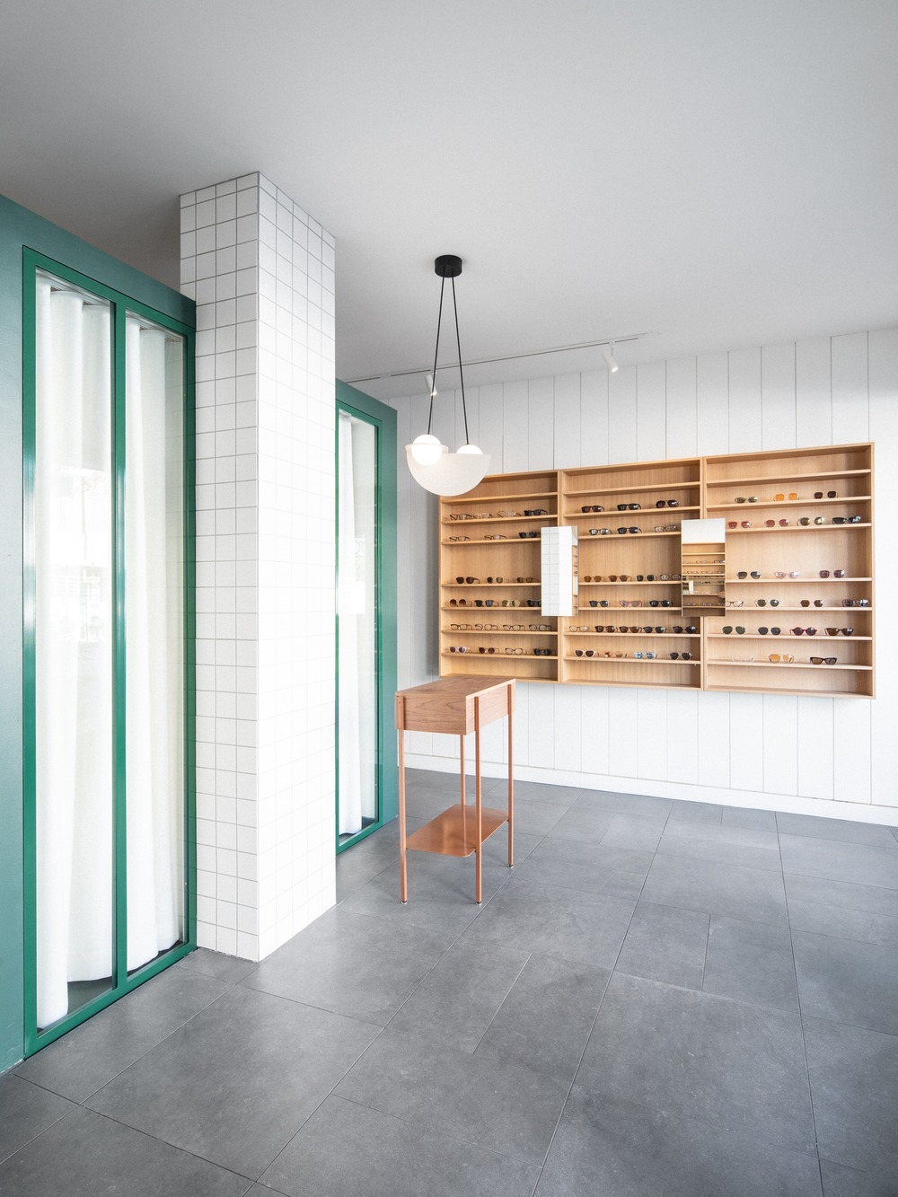 When choosing frames, a tray allows customers to make several choices and place them on one of the small tables. These tables are places against on a bench where one can wait, but on which customers can sit down to take the time to choose the right frames. The bench recalls a cafe and makes the place less medical. The materiality refers to the world of clinics, but is distinguished by its natural woods, ceramics and bright colors that reflect the brand image. The shop is warm, accessible and anchored in the neighborhood.
