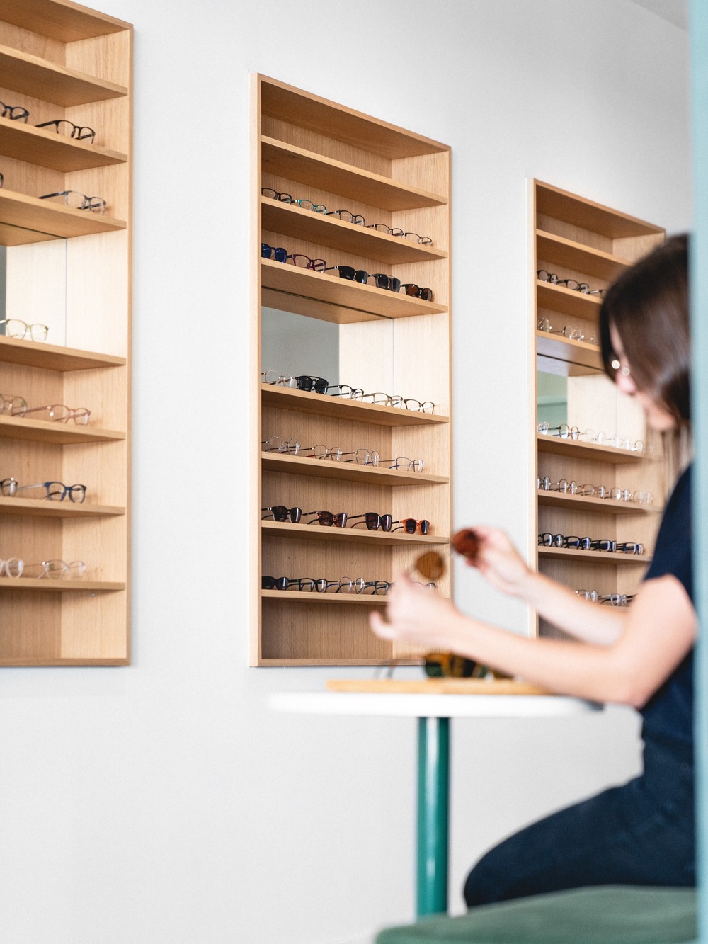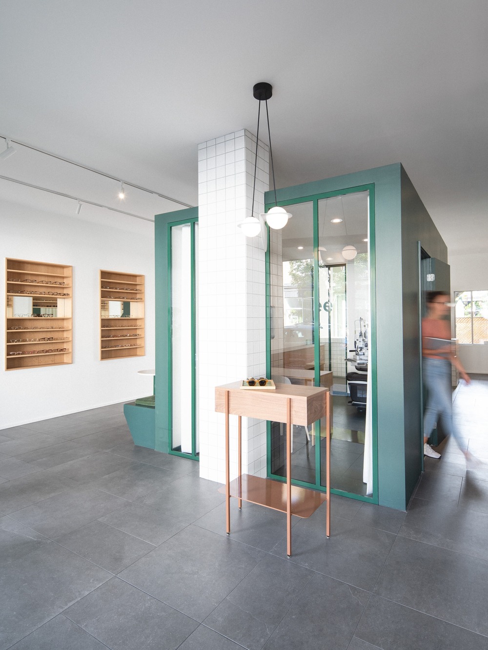 When choosing frames, a tray allows customers to make several choices and place them on one of the small tables. These tables are places against on a bench where one can wait, but on which customers can sit down to take the time to choose the right frames. The bench recalls a cafe and makes the place less medical. The materiality refers to the world of clinics, but is distinguished by its natural woods, ceramics and bright colors that reflect the brand image. The shop is warm, accessible and anchored in the neighborhood.