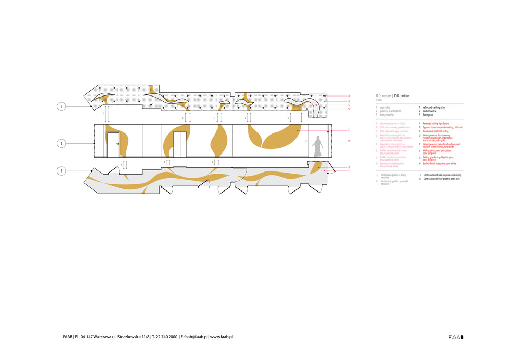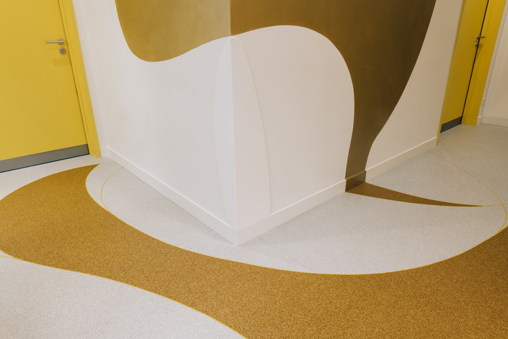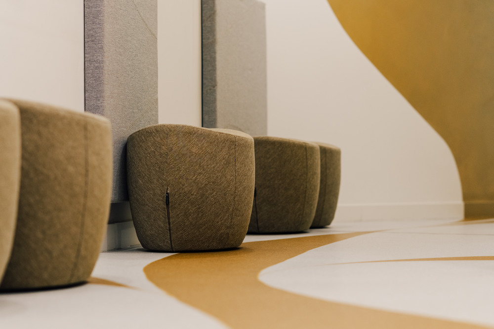 Fluid shapes, referencing the curves of a woman's body during pregnancy, are present on the floor, walls, and ceiling of the waiting room and corridors. In some places, they remain as two-dimensional, independent elements. In others, they connect the floor to the wall and ceiling, generating the illusion of movement. They become a three-dimensional form at the main entrance. This form is inspired by the tension of the skin on a woman's abdomen, as observed during pregnancy, the tensions caused by the muscle activity of fetal movement such as elbows and knees pressing against the womb. Textures, colors, and light reflection play an important role in the interior design. Translucent surfaces are juxtaposed with opaque surfaces. Matt surfaces contrast with the light-reflecting surfaces of the individually designed graphics. The choice of color for the graphics was carefully analyzed. Ultimately, the gold color was chosen to represent one of the most precious moments in a woman’s life - pregnancy.