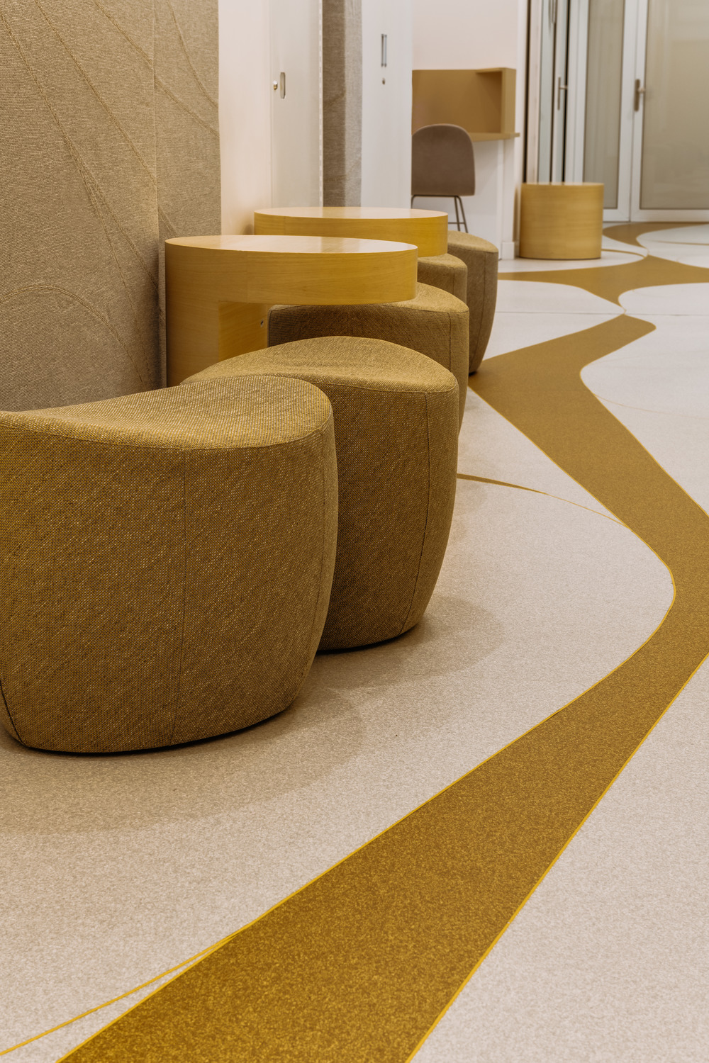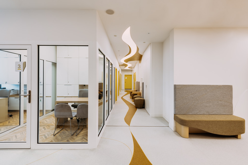 Fluid shapes, referencing the curves of a woman's body during pregnancy, are present on the floor, walls, and ceiling of the waiting room and corridors. In some places, they remain as two-dimensional, independent elements. In others, they connect the floor to the wall and ceiling, generating the illusion of movement. They become a three-dimensional form at the main entrance. This form is inspired by the tension of the skin on a woman's abdomen, as observed during pregnancy, the tensions caused by the muscle activity of fetal movement such as elbows and knees pressing against the womb. Textures, colors, and light reflection play an important role in the interior design. Translucent surfaces are juxtaposed with opaque surfaces. Matt surfaces contrast with the light-reflecting surfaces of the individually designed graphics. The choice of color for the graphics was carefully analyzed. Ultimately, the gold color was chosen to represent one of the most precious moments in a woman’s life - pregnancy.