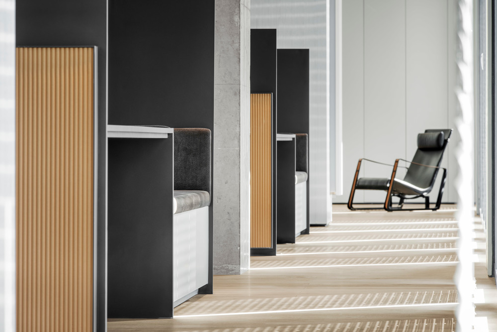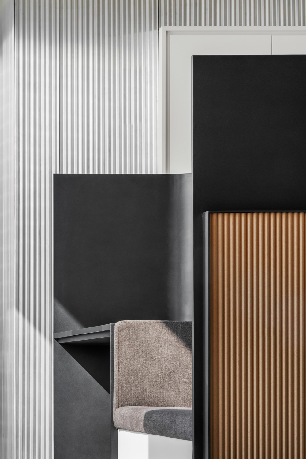 기존의 사무실 공간과 달리 입구는 로비와 접대가 없는 환경을 선택했다. 공간을 빼면 전체 사무실 공간을 더 완벽하게 만들 수 있다. 단순한 선 장식은 단단한 벽 대신 공간을 분리하는 기능이 있으며, 공간을 더욱 단순하게 만들어준다. 옷에 심플한 퀼팅 장식을 한 듯, 멀리서 보면 질서정연하고 가까이서 보면 정교한 디자인이다.