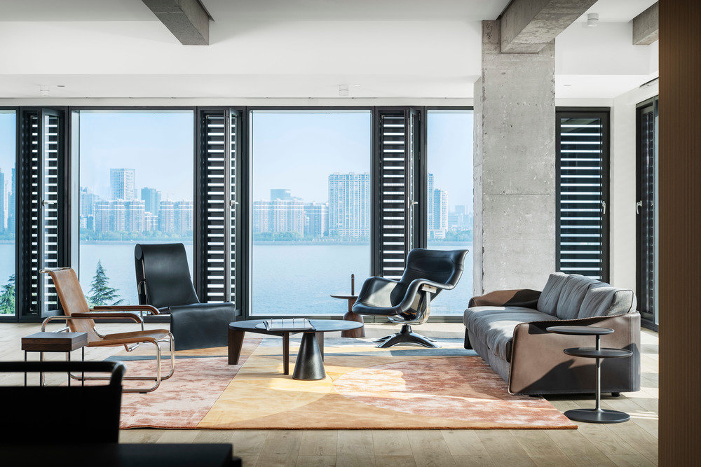 Entering the main space, the floor-to-floor window on one side allows the whole space to have an open view of the beautiful Qiantang River. Only simple colors are used in the space. The designer hopes to reproduce the texture and technology of the old industrial era.The use of new and old materials also makes space collide with a new visual atmosphere, just like the use of different materials in clothing, splicing out various collocations.