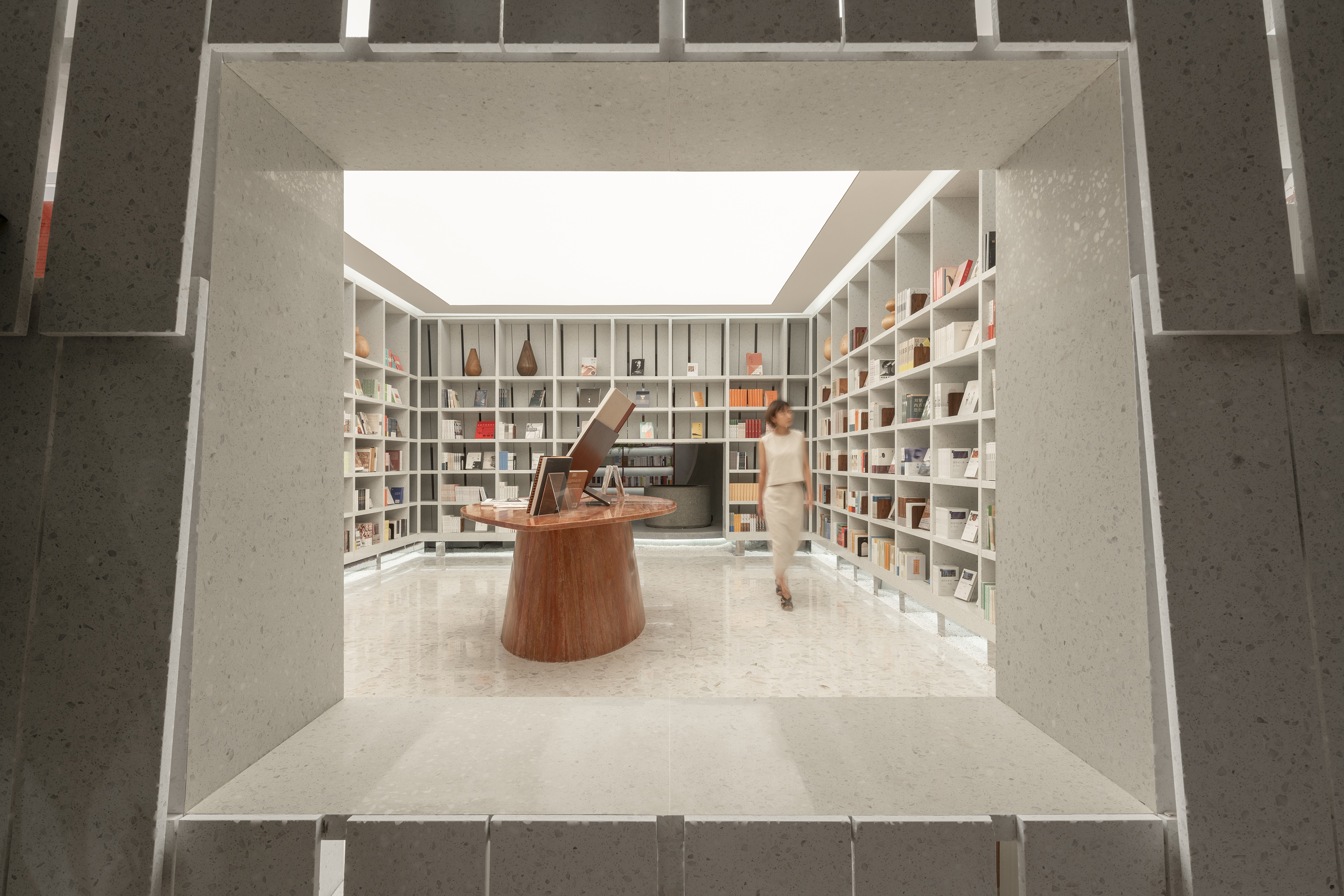 The design therefore became simple and straightforward. When the reader enters the door, he or she will see a white mountain, which is a book-shelf made of white artificial stone. The light comes through the stone wall, and then it looks like a light mountain, which is the Little You Mountain of the Toyou Bookstore. The visible Little You Mountain is the recommended area for new and fine books in the Toyou Bookstore.