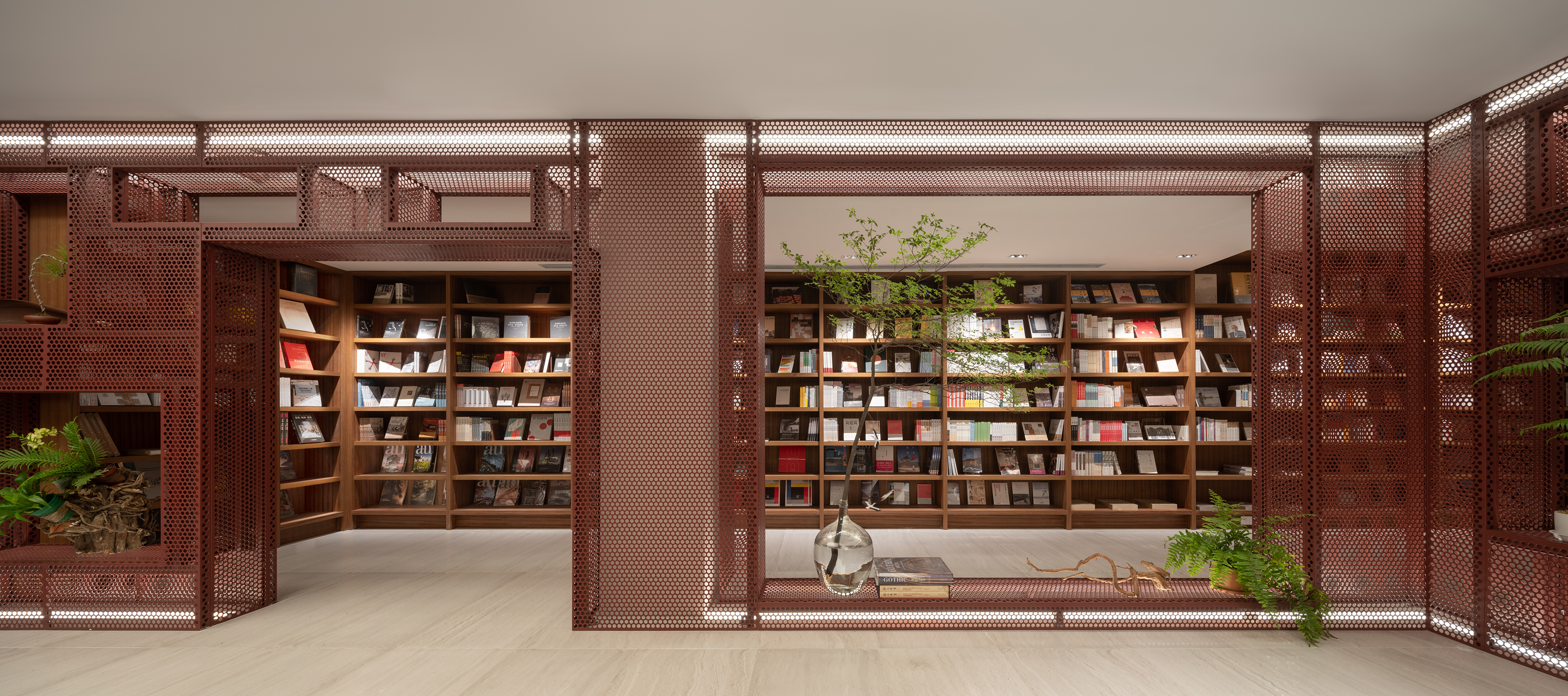 There is no distinctive visual image of the Big You Mountain in the Toyou Bookstore. Readers need to walk through the bookshelves and partitions to get to the main space of the bookstore, which is actually the interior of the Big You Mountain. The Big You Mountain is invisible because it's too big. As the old saying goes, you can't see the real face of the mountain, but only be thankful to be in the mountain. I abstracted the interconnected caves into the spatial experience we are used to, rather than a realistic simulation. The continuous burgundy perforated aluminum panels forming the caves and the bookshelves forming various corners and spaces to sit in are in fact the interlocking caves in Big You Mountain. It is in this cave that the reader finds the secret book waiting to be uncovered. The typological refinement of the cave helps the architect to use the organization of bookshelves, partitions, commodities and book arrangements to create a very rich spatial experience in a small space, so that there are surprises everywhere and identical views at every step.