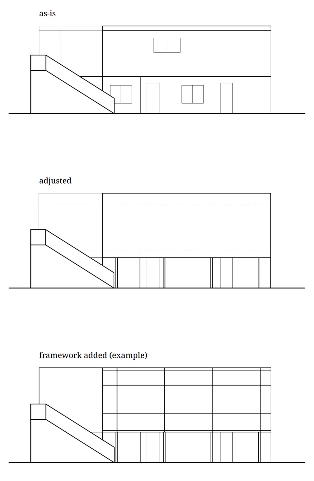 첫 번째, 파사드를 어떻게 디자인할 것인가가 가장 먼저 결정되어야했다. 설계 전 기존 건물에서는 2층 전면의 샌드위치패널이 매우 난감한 비율로 전체 사이트의 인상을 흔들고 있었다. 따라서, 어떤 재료를 어떻게 사용할지 정하기에 앞서 입면의 비율을 조정해서 이 건물의 존재감을 정립해줄 필요가 있었다. 우리는 2층의 입면을 위아래로 길게 늘려 해당 건물을 크고 힘있는 있는 덩어리로 정리했다. 덩치가 큰 매스이기는 하나 위압적인 입면이 되어서는 안된다는 생각에, 하나의 연속된 면이기 보다는 framework에 의해 분할된 구조적인 인상의 면이기를 의도했다. (Diagram1)